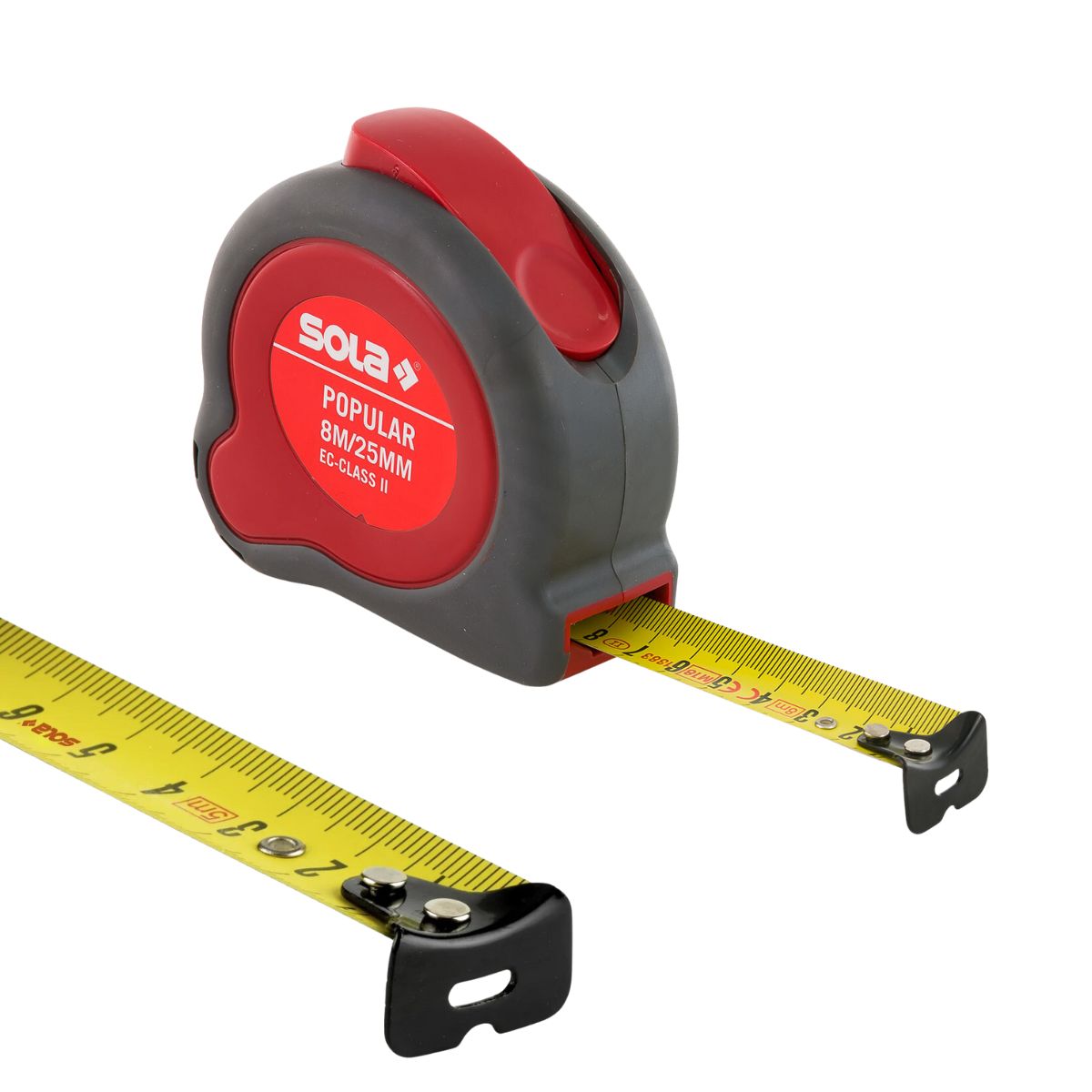 Гумирана ролетка Sola Popular PP 8 м е надежден инструмент и е изработен от удароустойчива двукомпонентна пластмаса, съчетаваща ABS и TPE термопласт, което осигурява здравина и издръжливост на инструмента. Гумираната противоплъзгаща повърхност и ергономичният дизайн гарантират безопасна работа и удобен захват. Лентата на ролетката е изработена от стомана с жълто, матово лакирано покритие, което осигурява ясна видимост и издръжливост. Ролетката разполага с прецизен стопиращ механизъм на лентата от 2 части, който позволява точни вътрешни измервания. Системата на амортисьорите гарантира внимателно и контролирано стопиране на лентата. Клипсът за колана е здрав и изработен от ABS термопласт, осигуряващ по-голяма устойчивост и сигурно закрепване на ролетката към колана. Ролетката отговаря на клас II точност съгласно директивата на ЕО, което гарантира нейната прецизност и надеждност при измерванията.
