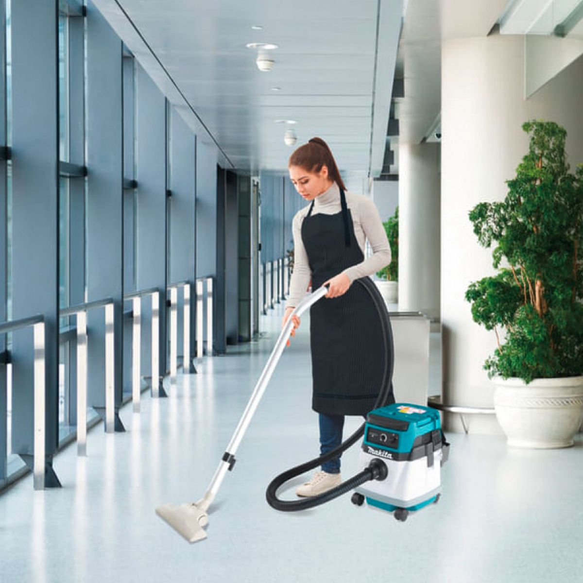 Хибридна прахосмукачка Makita DVC150LZ има двойна система за захранване – с АС захранване или от две Li-Ion батерии с напрежение 18 V. Въздушният дебит е 3600 – 2100 l/min и мощност на засмукване с батерия 9,8 kPa. Обема на контейнера за прах е 15L, а за вода 12L. Има ергономична дръжка за удобно почистване и няколко накрайника за различни приложения.  Прахосмукачката е оборудвана с индикатор за състоянието на батерията и индикатор за капацитета й. Makita DVC150LZ е идеално решение за поддържане на чистота в дома и почистване на автомобил. Оборудвана с подвижна кутия за съхранение на аксесоари и батерии. Включва накрайници за под и диван за разнообразни приложения.