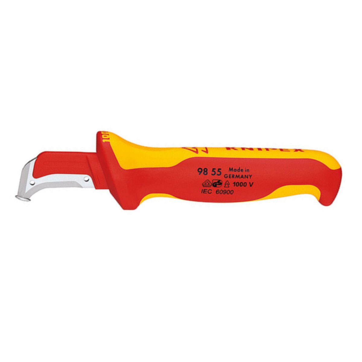 Изолиран нож за кабели Knipex 98 55 предлага комбинация от функционалност и безопасност, като осигурява ергономична форма на дръжката с предпазител за приплъзване и вдлъбнатини за по-добър захват. Меките компоненти на дръжката предпазват от приплъзване и гарантират сигурен захват, дори при влажни условия. Вградената „кука за пръст“ и извитото острие предоставят удобство и лесно управление при използване. Здравото острие, изработено от специална хирургична стомана, е проектирано с прозрачно защитно капаче, което предпазва и предлага сигурно съхранение на ножа.