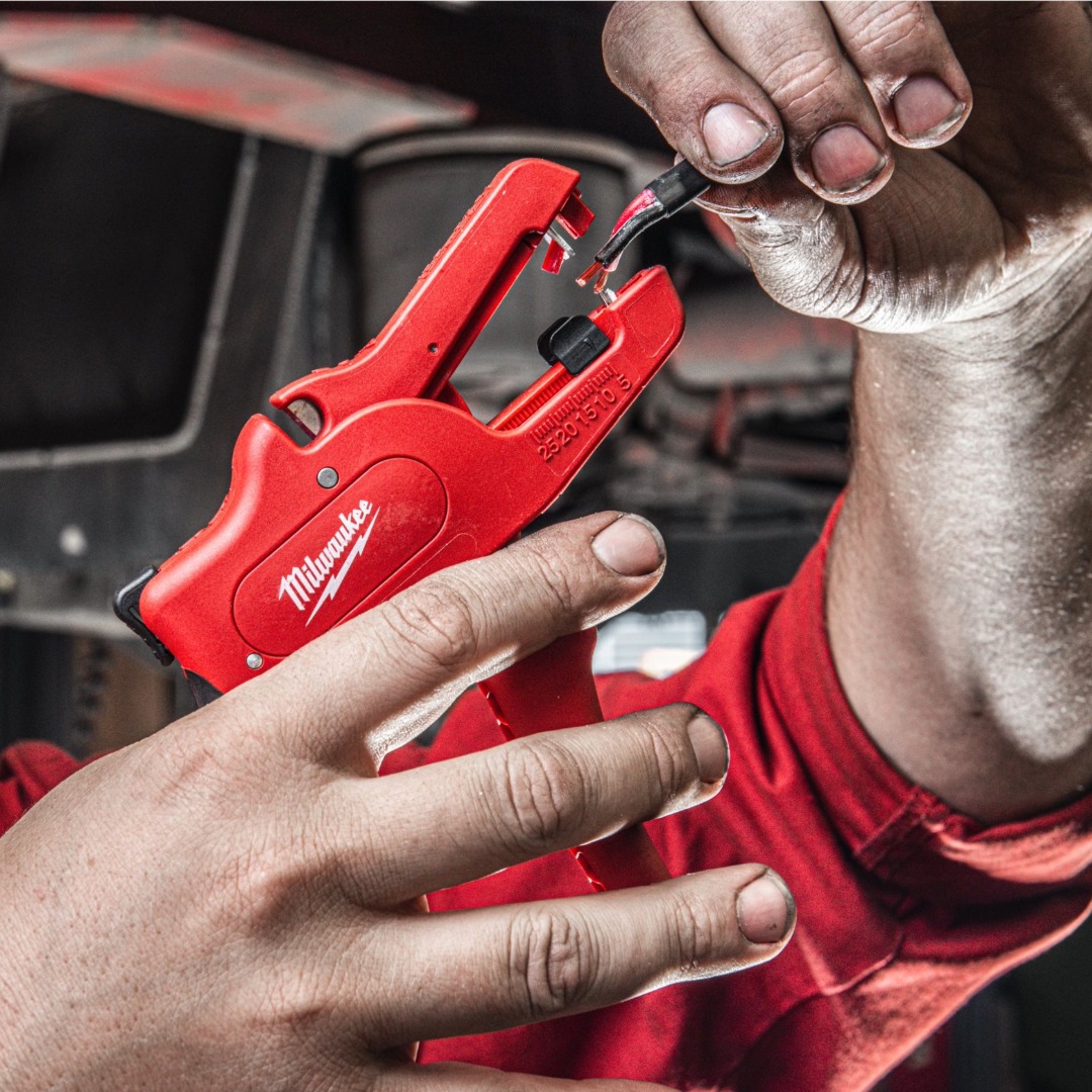 Клещи за оголване на кабели Milwaukee 4932498268 са проектирани за бърза, прецизна и удобна работа при електроинсталации. Оборудвани са с регулируем ограничител на дължината от 5 до 25 мм, който осигурява последователни и точни резултати, както и с вграден страничен нож за рязане на проводници до 3 мм, усукани кабели до 10 мм² и твърди кабели до 6 мм². Настройката на острието може да се адаптира спрямо различни материали и условия на работа, включително при големи температурни разлики. Компактната и лека конструкция прави клещите подходящи за работа с единични, многожилни и финожилни кабели със сечение от 0,2 до 16 мм² и стандартна изолация. Тънкият дизайн на главата улеснява достъпа до тесни и труднодостъпни зони, а двукомпонентната ергономична дръжка осигурява комфорт, сигурен захват и ефективно предаване на силата. За допълнително удобство и безопасност инструментът разполага с интегриран етикет, заключващ механизъм и отвор за ремък.