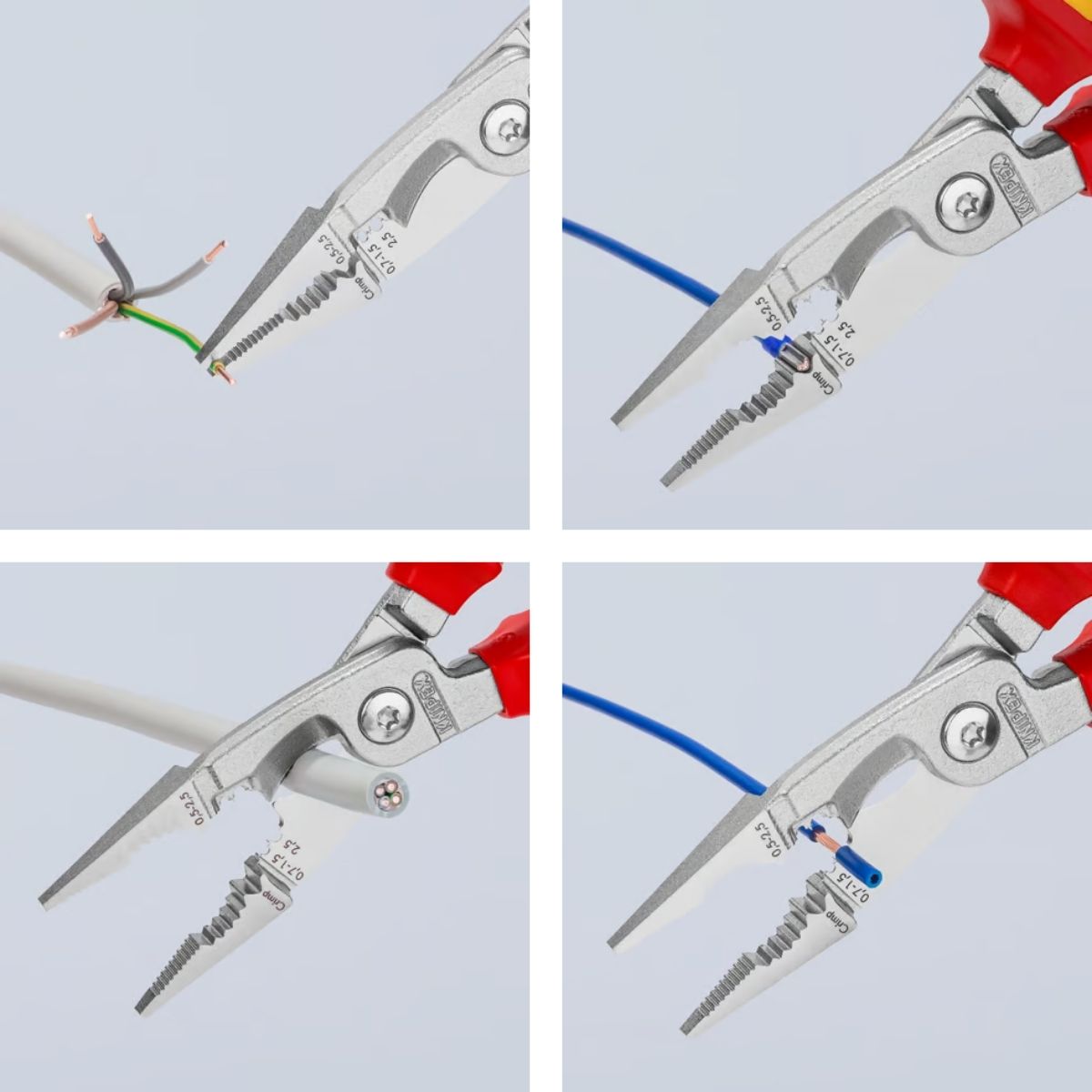 Комбинирани клещи Knipex 13 86 200 са мултифункционален инструмент, специално създаден за електрически инсталации, обединяващ 6 функции в едно. Клещите позволяват захващане на плоски и кръгли материали, огъване, обрязване на мустаци, рязане на кабели, сваляне на изолация и кримпване на гилзи. Изработени са от висококачествена специална инструментална стомана, закалена в масло за максимална издръжливост. Гладките плъзгащи повърхности на върха захващат деликатно без да повреждат отделни жички на проводника. Профилираните захващащи повърхности и специалният отвор осигуряват сигурен захват на различни форми материали. Характерният външен ръб на челюстта е идеален за работа със скрити кутии и изрязване на мустаци. Инструментът оголва кабели с размери 0,7-1,5 мм² и 2,5 мм², а кримпгнездото работи с гилзи от 0,5 до 2,5 мм². Кабелната ножица реже медни и алуминиеви кабели до 5х2,5 мм² или диаметър 15 мм. Компактната форма позволява работа в тесни пространства, а прецизният винтов шарнир гарантира стабилен и плавен ход на инструмента.