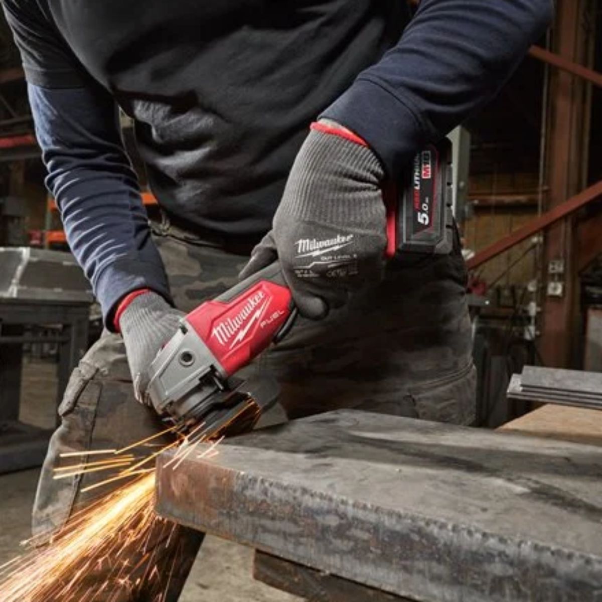 Комплект акумулаторен ъглошлайф Milwaukee M18FSAG125XB100P-502P работи с напрежение 18 V и е оборудван с батерия с капацитет 5 Ah. С диаметър на диска от 125 мм и максимална дълбочина на рязане от 33 мм, този инструмент предлага производителност, сравнима с 1200 W мрежов ъглошлайф. Устройството разполага с резба на шпиндела M14 и функция RAPIDSTOP, която спира въртенето на острието за по-малко от 2 секунди. Антивибрационната странична дръжка намалява вибрациите, осигурявайки по-комфортна работа. Комплектът включва 2 батерии, зарядно устройство и 95 режещи диска, всичко това в удобен и практичен куфар за съхранение.
