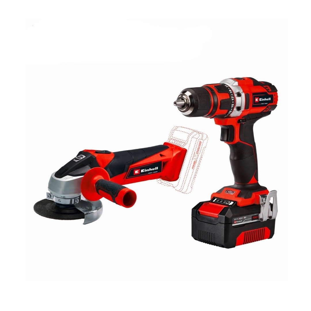 Комплект акумулаторен винтоверт и ъглошлайф Einhell TE-TK 18/2 Li Kit, включва: