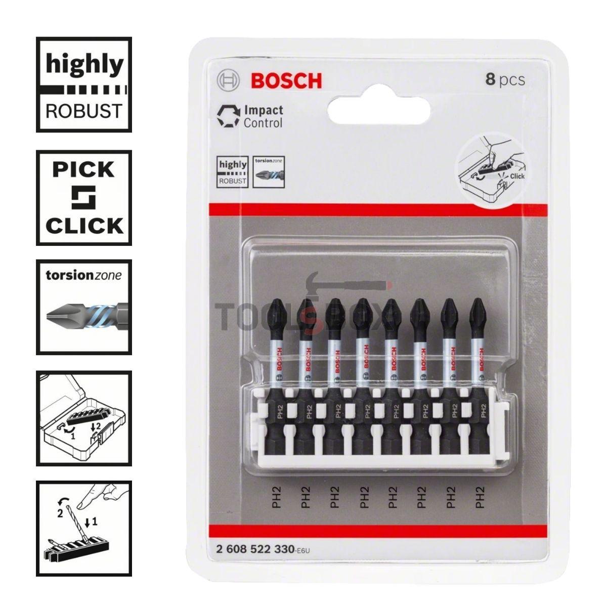 Комплектът накрайници Bosch 2608522330 Impact се състои от 8 части с разширена торсионна зона, което ги прави изключително здрави за дълготрайна работа. Комплектът е изключително здрав и идеален за приложения с голямо натоварване, като дори издържа на високата мощност на ударни винтоверти. Модифицираната стомана S2 и оптимизираният процес на термообработка осигуряват допълнителна издръжливост за висока производителност, включително при заводски инсталации или тежки промишлени дейности. Разполага с 1/4-инчова външна шестостенна опашка за използване с акумулаторни бормашини, отвертки и особено с ударни винтоверти. Битът е част от системата Pick and Click на Bosch, която позволява да се съставят индивидуални набори от консумативи за изцяло персонализирани колекции от битове. Гнездата за поставяне с щракване идеално закрепват индивидуално закупените пакети за съставяне на персонализирана колекция и лесна замяна на стари пакети. Битът се доставя в пластмасов държач, който може лесно да се защракне в празните кутии M и L Pick and Click за персонализирани варианти на набори от битове и свредла.