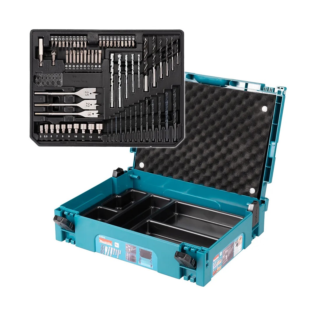 Комплект битове и свредла Makita E-24913 е практично и надеждно решение за всеки майстор или домашен потребител, който търси всичко необходимо за пробиване и завинтване на едно място. Състои се от 70 висококачествени части, включващи разнообразни свредла и битове, изработени от здрава HSS стомана за дълъг експлоатационен живот и устойчивост при работа с различни материали. Всички накрайници са съвместими с повечето модели бормашини и ударни винтоверти, което осигурява максимална универсалност. Комплектът се предлага в здрав и удобен пластмасов куфар Makpac, който гарантира лесно съхранение, подредба и безопасно пренасяне на инструментите, където и да се намирате.