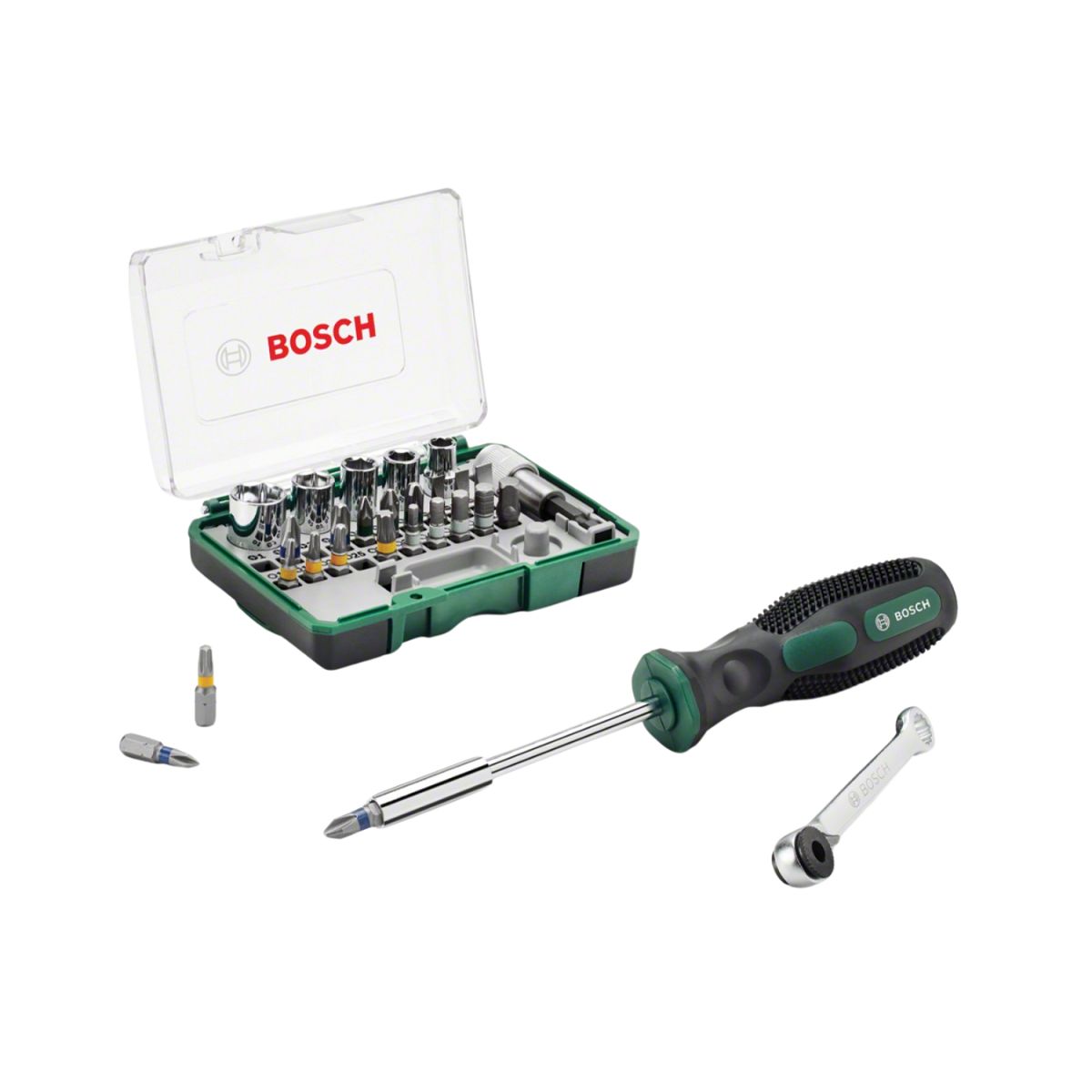 Комплект битове с отвертка и минитресчотка Bosch 2607017331 съдържа 27 части, включително универсален държач, отвертка и минитресчотка. Накрайниците са разнообразни, позволявайки лесно изпълнение на различни задачи. Комплектът е опакован в удобна пластмасова кутия с прозрачен капак, което осигурява лесен достъп и подреденост на инструментите.