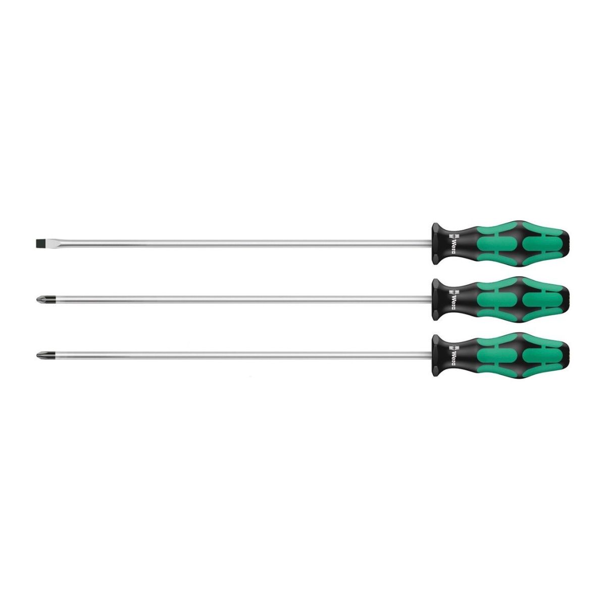 Комплект дълги отвертки Wera 347735 са изработени от хромирана закалена стомана с изключително здрави остриета, готови да предложат голяма устойчивост и дълъг живот. Wera Lasertip остриетата захапват материала веднага, без нуждата от нагласяване. С противоплъзващо и анти-корозионно покритие, отвертките гарантират дълъг експлоатационен живот. Шестоъгълна многокомпонентна дръжка Kraftform предотвратява търкалянето на инструмента. Закалените накрайници осигуряват по-голяма издръжливост и намалено износване. Отвертките са с дължина от 300 мм и са 3 бр. Оборудвани с цветна маркировка за лесно идентифициране.