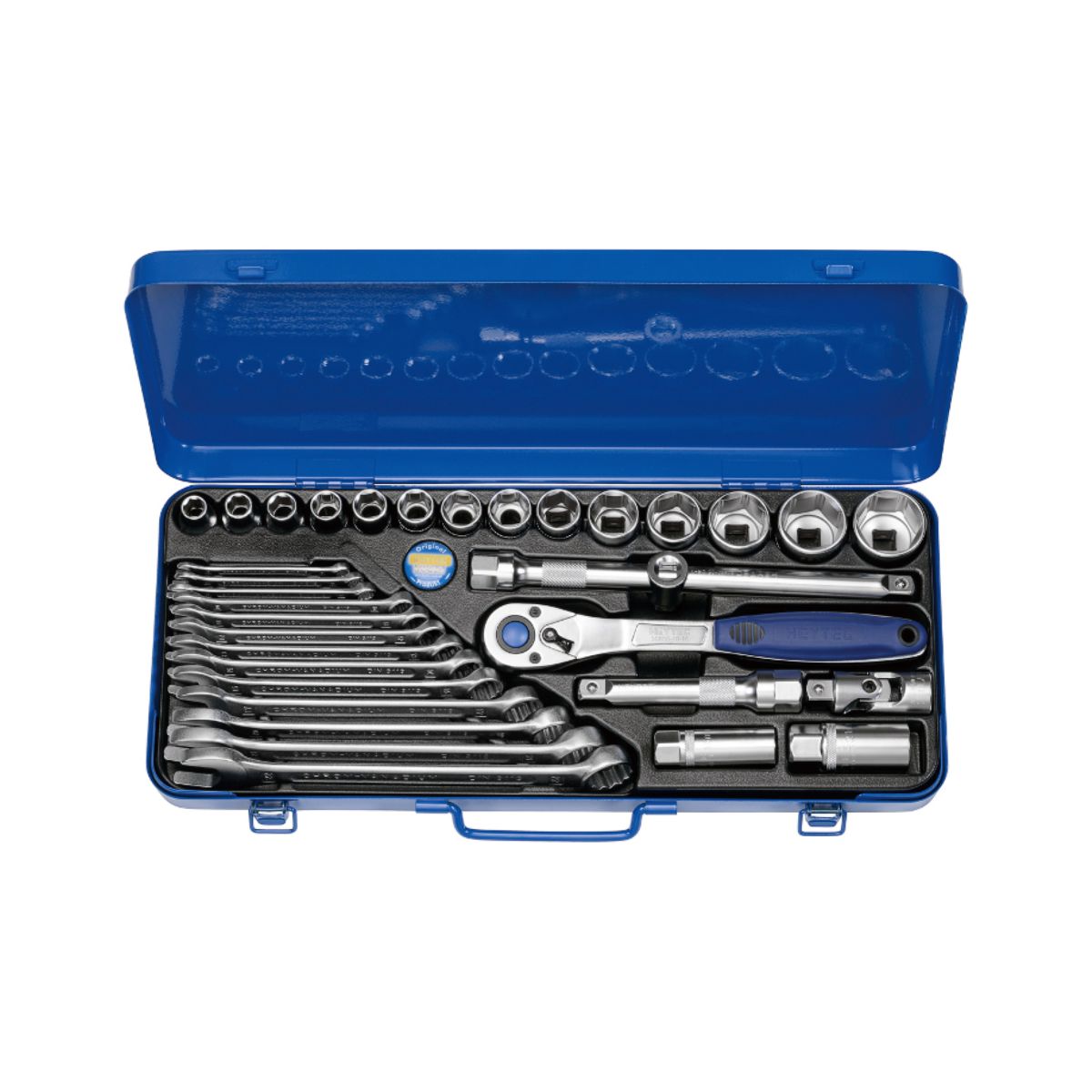 Комплект гедоре Heytec 50860301580 съдържа 33 части от висококачествена хром-ванадиева стомана с хромирано покритие, събрани в здрава метална кутия (450x187x52 мм). Включва тресчотка 255 мм с 72 зъба, върток 250 мм, кардан 75 мм, удължител 125 мм, 13 звездогаечни ключа (6–22 мм), 14 шестостенни вложки 1/2″ (10–32 мм) и 2 вложки за свещи (16 и 20,8 мм). Комплектът е идеален за професионална и домашна употреба, гарантирайки издръжливост и прецизност при различни монтажни и ремонтни задачи.