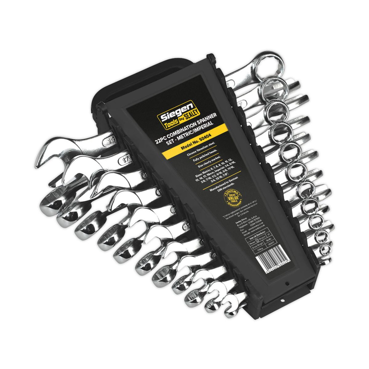 Комплект комбинирани гаечни ключове Sealey S0404 представлява част от гамата качествени инструменти на Siegen by Sealey, предлагани на конкурентни цени. Тези гаечни ключове са изработени от висококачествена хром-ванадиева стомана, която гарантира тяхната здравина и издръжливост. Главите на ключовете са напълно полирани, което не само им придава естетичен вид, но и ги прави устойчиви на корозия. Те са произведени в съответствие с DIN стандартите за качество и прецизност. Комплектът включва гаечни ключове с различни размери, което ги прави подходящи за разнообразни приложения. Те се доставят в подложка за съхранение и пренасяне, което улеснява организацията и транспортирането на инструментите до работното място.