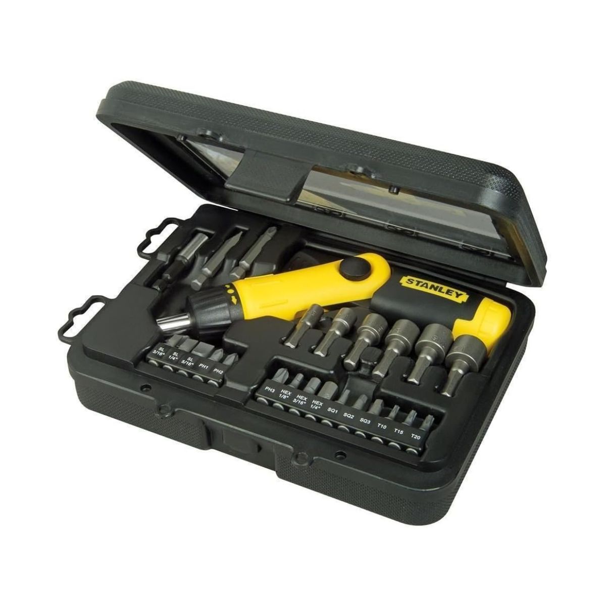 Комплект магнитна отвертка и накрайници STANLEY 0-63-022 е изработен от висококачествен антикориозен материал, гарантиращ дълъг експлоатационен живот. Комплекта включва магнитна отвертка със сменяеми накрайници, която позволява бърза и лесна смяна на различни видове битове, както и едни от най-използваните накрайници. Самозатягаща се дръжка изработена от два вида материал осигурява стабилност и контрол при работа. Има 3-позиционен тресчотъчен механизъм, с който можете да регулирате ъгъла на 0º, 45º и 90º. За по-голямо удобство на потребителя отвертката предлага място за съхранение на няколко бита в дръжката си, така че да можете винаги да имате под ръка най-използваните накрайници. Доставя се в удобен пластмасов куфар, така че лесно да съхранявате и транспортирате инструментит си до работното място.