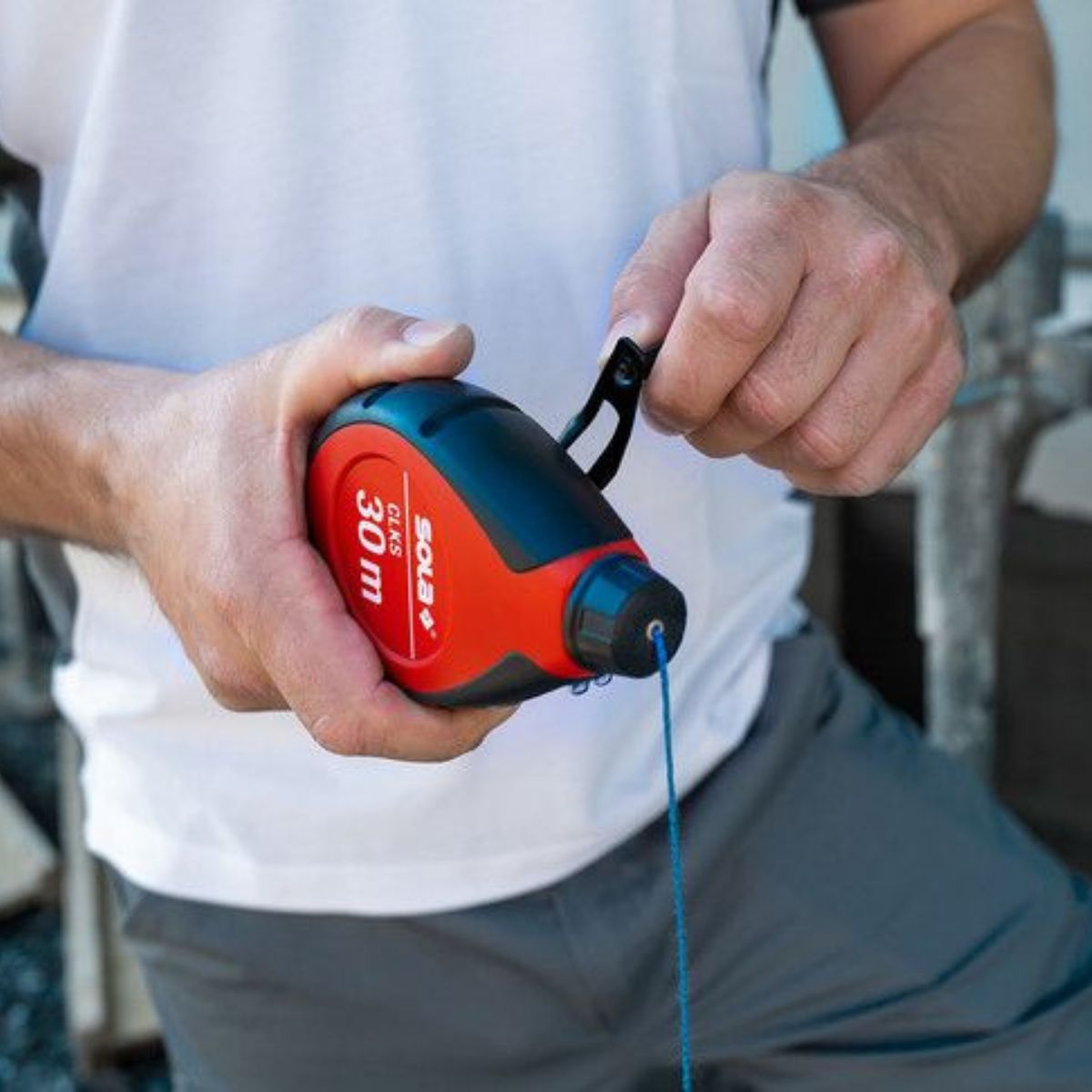 Комплект маркиращ конец и прах Sola CLKS SET B е снабдена с манивела, тя осигурява до 6 пъти по-бързо прибиране на въжето, ускорявайки работния процес. Корпусът на чертилката е изработен от здрава пластмаса, допълнително защитена с гумен капак, а дръжката е изработена от закалена стомана за дълготрайна издръжливост. В чертилката е вградено специално място за съхранение на куки, което осигурява удобство при носене и съхранение на аксесоарите. Прозорчето на чертилката позволява лесно следене на останалото количество креда. Шнура е изработен от полиестерен мултифиламент, предоставяйки здравина и надеждност при използване. Тази чертилка представлява практично и надеждно решение за зидарски проекти в сухо строителство.