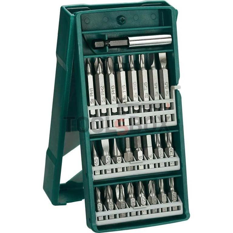 Комплект за завинтване, 25 накрайника Включва: – 16 бита 25 мм * PH 1 мм, 2 мм, 3 мм; * PZ 1 мм, 2 мм, 3 мм; * SL 4.5 мм, 5.5 мм, 8 мм; * HEX 4 мм, 5 мм, 6 мм; * T 15 мм, 20 мм, 25 мм, 30 мм; – 8 бита 50 мм * PH 1 мм, 2 мм, 3 мм; * SL 4.5 мм, 5.5 мм; * T 15 мм, 20 мм, 25 мм;