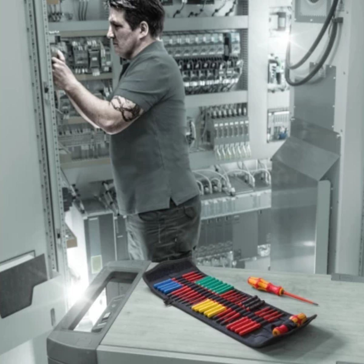 Комплект отвертка с накрайници Wera 05006617001 включва 2 изолирани многокомпонентни ръкохватки и 24 сменяеми стебла с дължина 157 мм, оборудвани с удобния идентификатор Take it Easy (TIE) за бързо разпознаване на размерите чрез цветно кодиране и лазерни маркировки. Ръкохватките Kraftform са проектирани за безопасност и комфорт, с многокомпонентна структура за стабилен захват и ергономичен дизайн, който предотвратява „търкалянето“. С интегрирана защитна изолация и конусовидно стебло, инструментите осигуряват лесен достъп до дълбоко разположени винтове и елементи. Всеки инструмент е тестван индивидуално за работа при напрежение до 1000 V, съгласно строгите изисквания на стандарта IEC 60900, което гарантира безопасност и надеждност дори при екстремни условия. Комплектът се предлага в здрава текстилна сгъваема чанта, която може да бъде прикрепена към системата Wera 2go или лесно монтирана на стена, рафт или количка, осигурявайки удобство и организация на работното място.