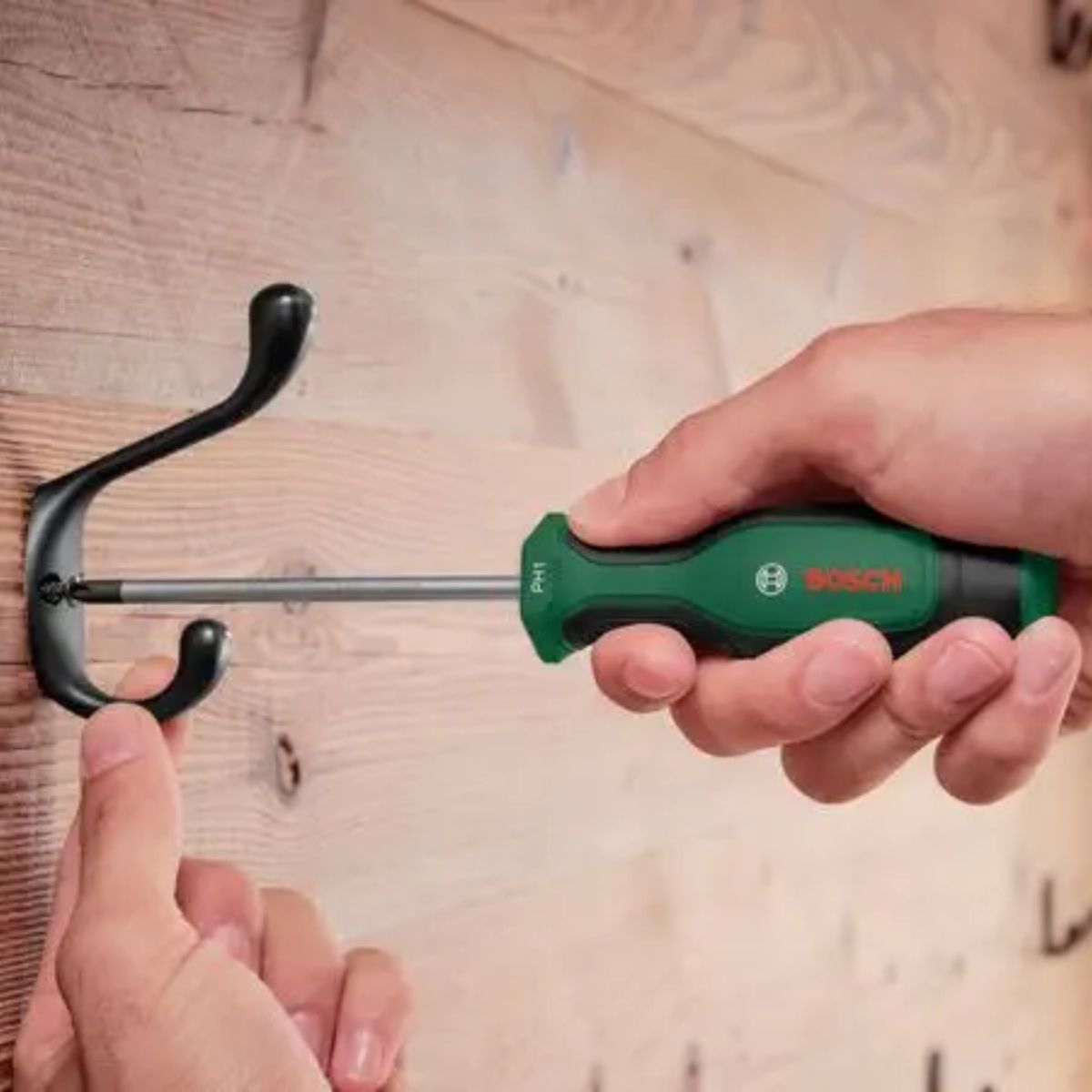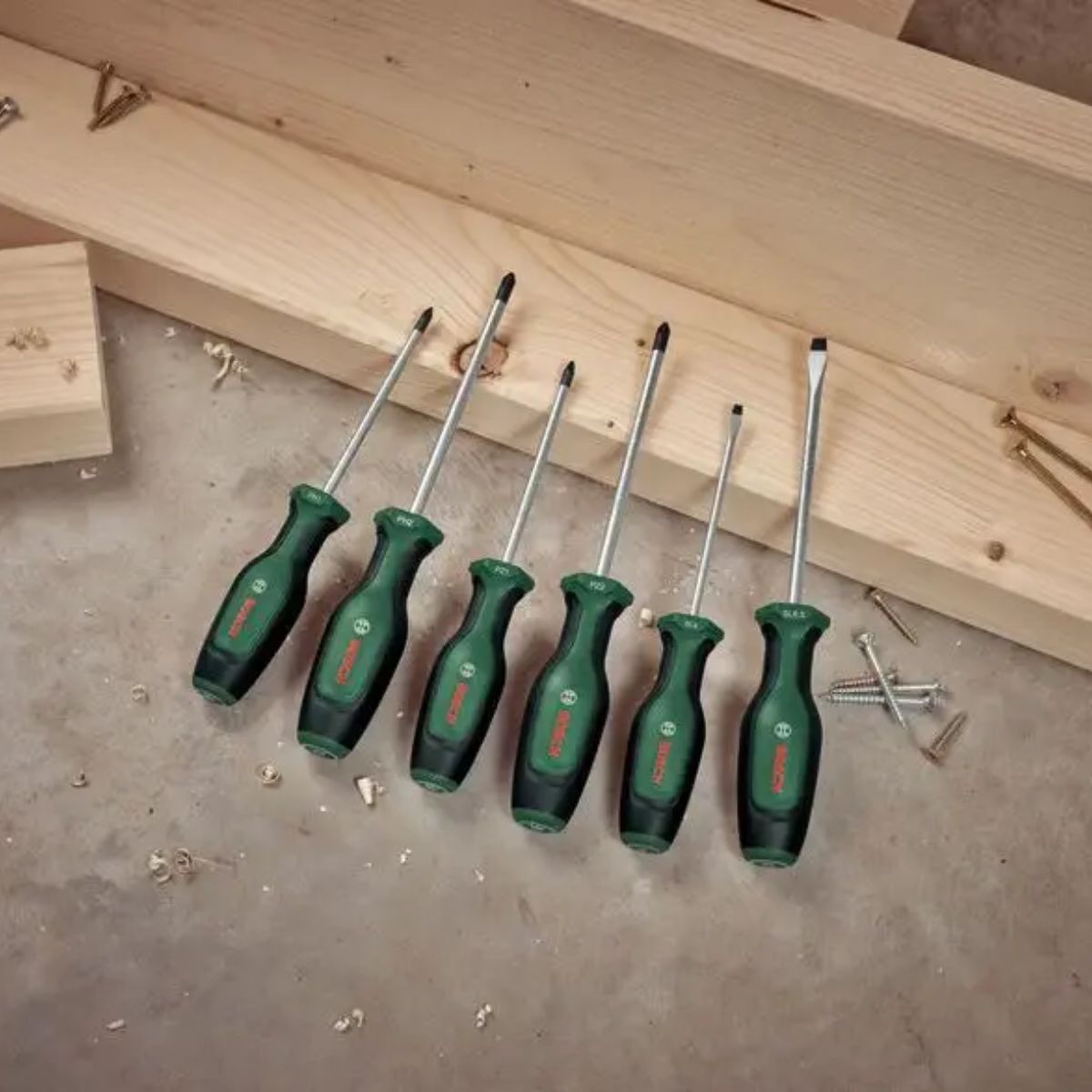 Комплект отвертки Bosch 1600A02BX7 са изработена от висококачествена хром-ванадиева стомана, гарантираща дълъг експлоатационен живот без корозия. Меката ергономична ръкохватка позволява пълен контрол при маневриране с различни инструменти. Комплектът съдържа 6 бр отвертки с различен профил, за максимален комфорт при различни задачи. Магнитният край дава удобство крепежните елементи лесно да се закрепят и работата да се осъществява по-лесно.