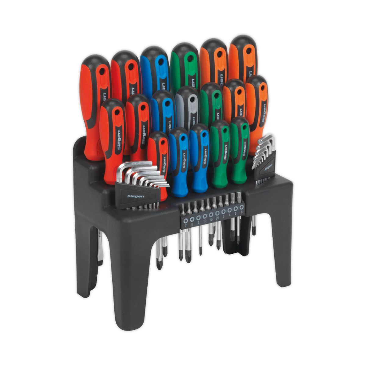 Комплект отвертки, ключове и битове Sealey S01090 е част от гамата висококачествени инструменти на Siegen by Sealey, предлагащи конкурентни цени. Включва разнообразие от отвертки с популярни размери, шестостенни ключове, държач за битове и накрайници. Изработени от хром-ванадиева стомана със сатенирано покритие, което ги прави устойчиви на корозия. Отвертките и ключовете имат пескоструйно обработени и магнетизирани върхове за по-добър захват. Дръжките са с меки покрития, кодирани с цветове за лесно разпознаване на размерите, а също така имат и отвор за окачване за удобно съхранение.
