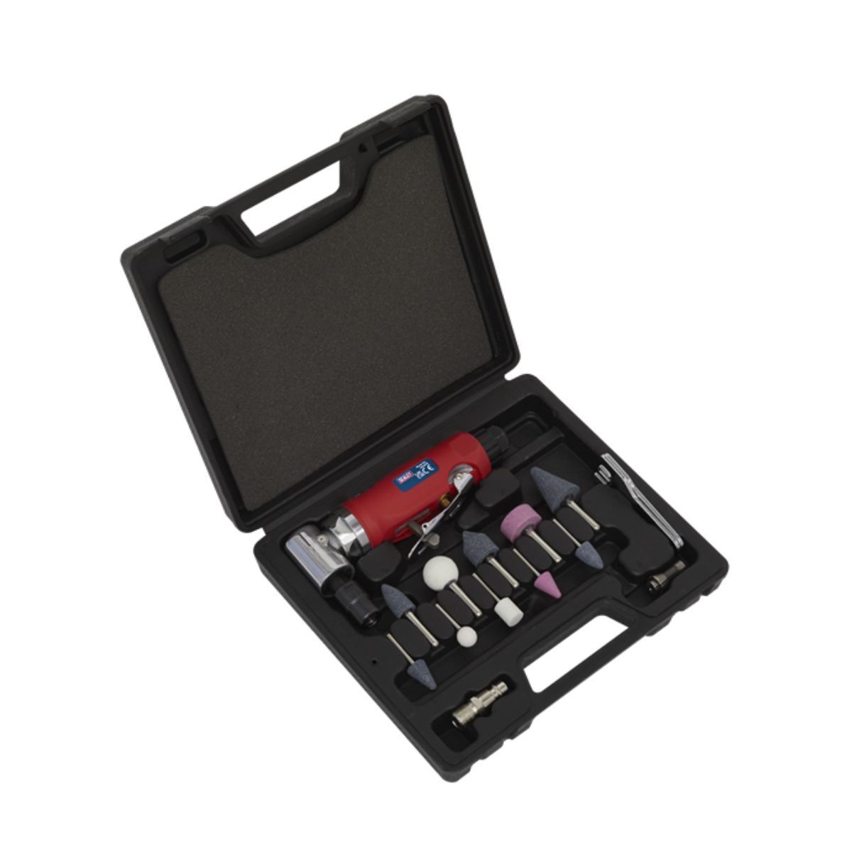 Комплект пневматичен шлайф Sealey GSA675 от серията Generation е мощен инструмент, създаден за професионална употреба и осигуряващ висока ефективност при шлайфане. Шлайфът разполага с удобна дръжка, която изолира вибрациите, осигурявайки комфорт по време на продължителна работа. Инструментът е оборудван с насочено изпускане на въздух с ниско ниво на шум, което може да се върти на 360°, предоставяйки допълнителна защита и удобство за оператора, като предотвратява въздушния поток да бъде насочен към него. Комплектът включва набор от шлифовъчни накрайници, които покриват различни нужди за шлайфане, както и гаечни ключове за лесна поддръжка и настройка на инструмента. Всичко това е удобно събрано в кутия за съхранение, което прави комплекта практичен и лесен за транспортиране и организиране. Sealey GSA675 е идеалният избор за професионалисти, които търсят надеждност и висока производителност при шлайфане.
