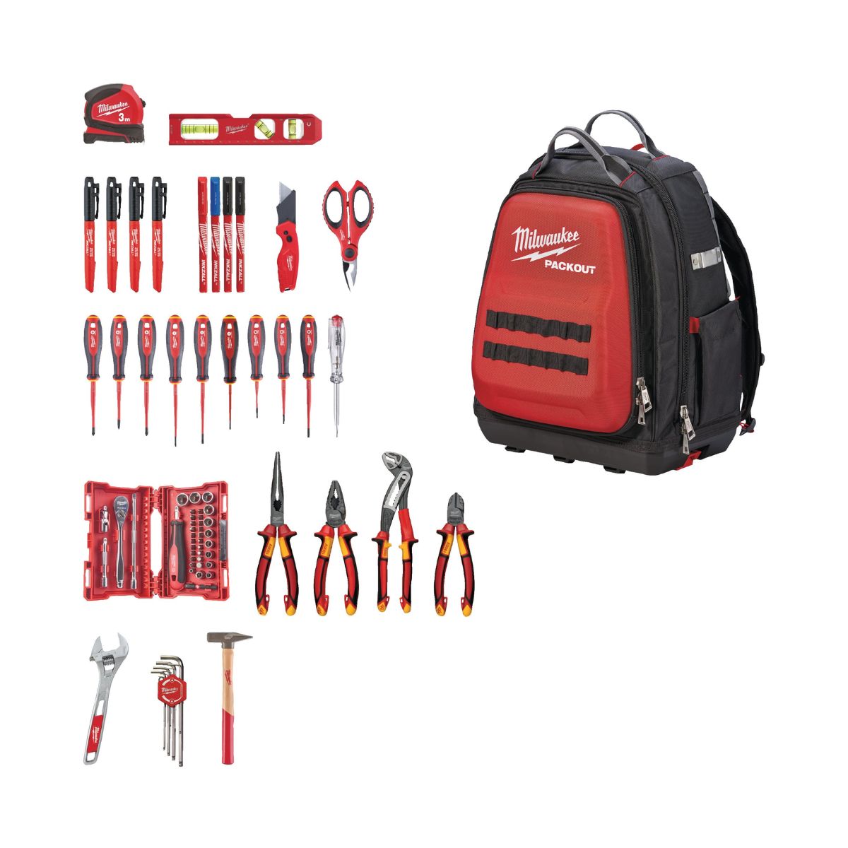 Комплект раница с инструменти Milwaukee 4932498407 е идеален избор за електричари и професионални майстори. Комплектът включва 76 части, изработени от висококачествена стомана с хромирано покритие за дълготрайна издръжливост. В него ще откриете от комплект гедоре от 38 части, шестограмни ключове, изолирани отвертки, нож, нивелир, ролетка до маркери за отбелязване и други, което прави всеки майстор готов за професионална работа, гарантирайки му удобство и издръжливост. Всички инструменти се съхраняват в раница Packout, която може да се прикрепя към другите компоненти от серията Packout, спестявайки ви усилията от носене. Тя е оборудвана със защитен джоб с твърда обвивка за по-чувствително или лесно чупливо оборудване. Удароустойчивата полимерна основа предпазва съдържанието от вода, замърсявания и разкъсване, и позволява на раницата да стои изправена. Има допълнителна подложка за гърба, каишка за гърди, каишка за закрепване на търкалящи се инструменти или аксесоари и тежък колан.