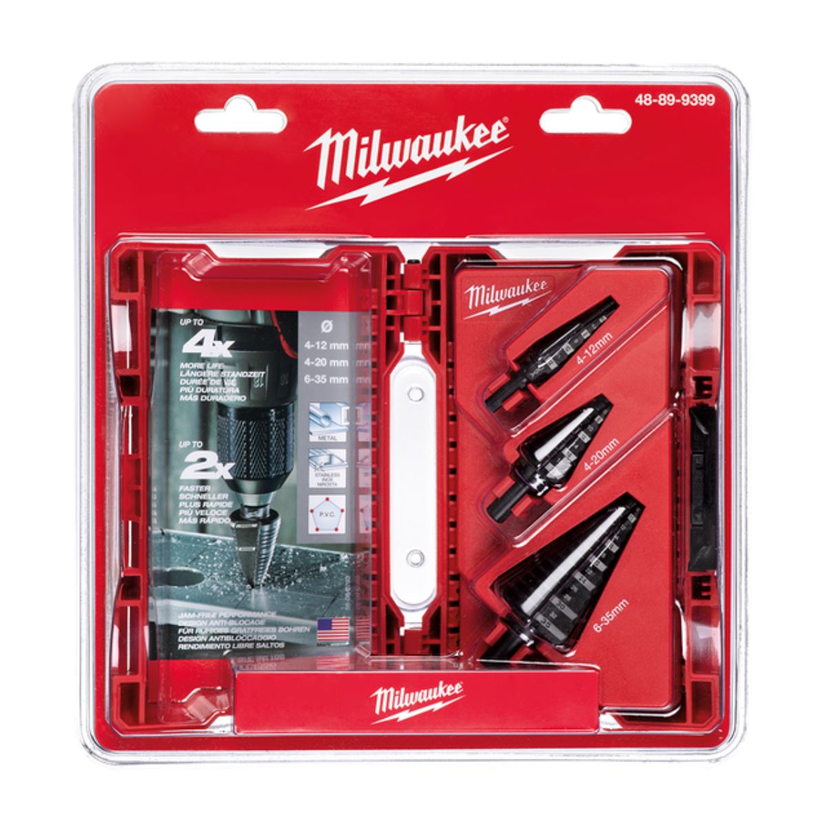 Комплект стъпаловидни свредла Milwaukee – 3бр. от 4-35мм се използва най-често от техниците, които работят в сферата на електрическите, ВиК и автомобилни услуги, за пробиване в черни и цветни метали, тръби, мед, месинг, алуминий, неръждаема стомана и пластмаса с максимална дебелина на материала 4мм. В сравнение с конвекцоналните модели, стъпаловидното свредло е по-издръжливо и устойчиво на счупване. Специално изработен връх за предотвратяване забиването на свредлото, както и намаля деформацията на пробития материал. Уредът е изработен от висококачествена стомана с черно оксидно покритие за 4 пъти по-дълъг живот. Свредлото е подходящо за ползване с акумулаторни бормашини.