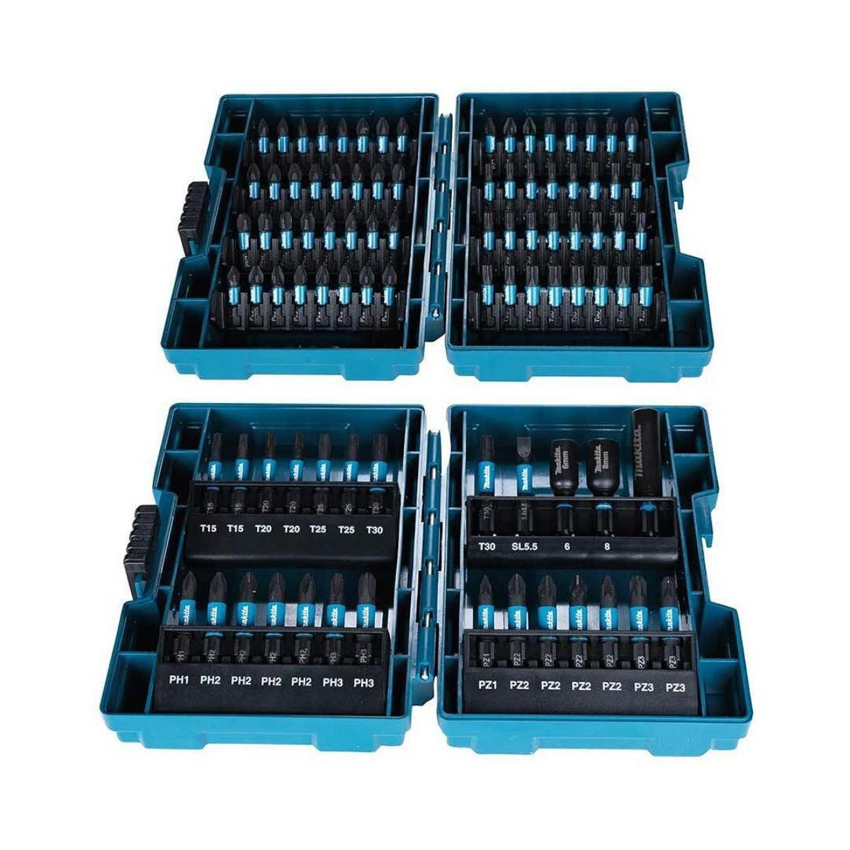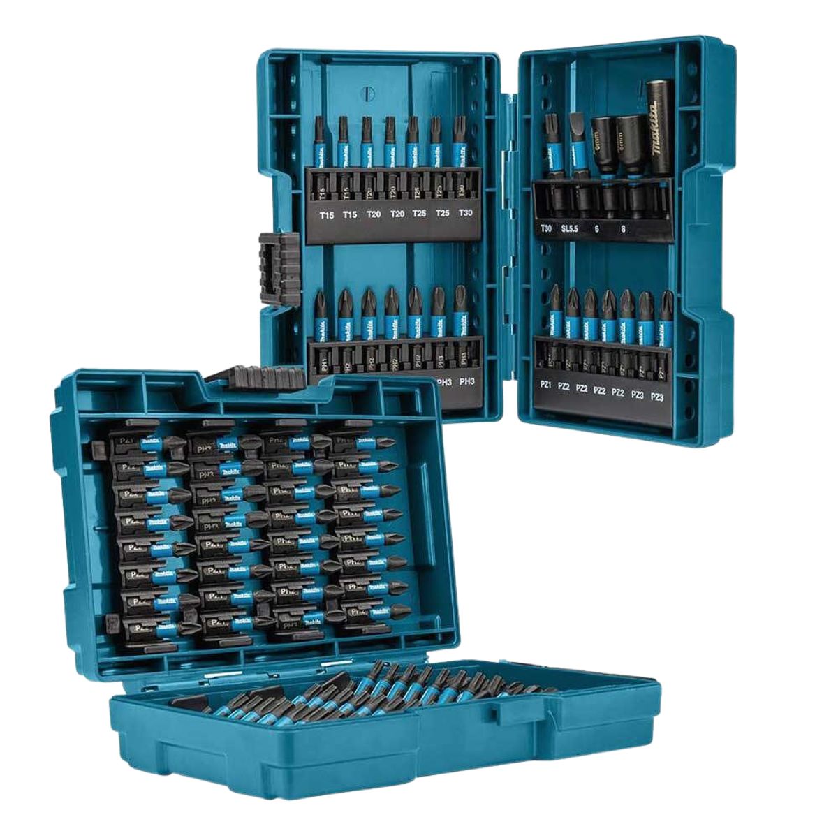 Комплект ударни накрайници Makita E-03109 от 90 броя, изработени от висококачествен материал с размер от 25, 50 и 60мм. Разполага с удобна пластмасова кутия – куфар с компактен дизайн със закопчалка за лесно транспортиране до работното място. Изработени с черно покритие за предпазване от ръжда, те са 20% по-издръжливи от стандартните винтови накрайници. Отпечатани са видовете битове на самия калъф за лесно четене на съдържанието на комплекта, което позволява на потребителя да избере необходимия бит бързо и лесно. Доставя се в две пластмасови кутии.