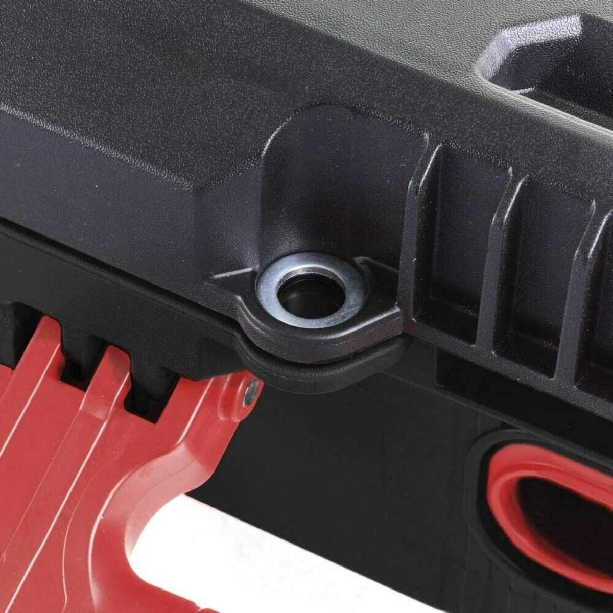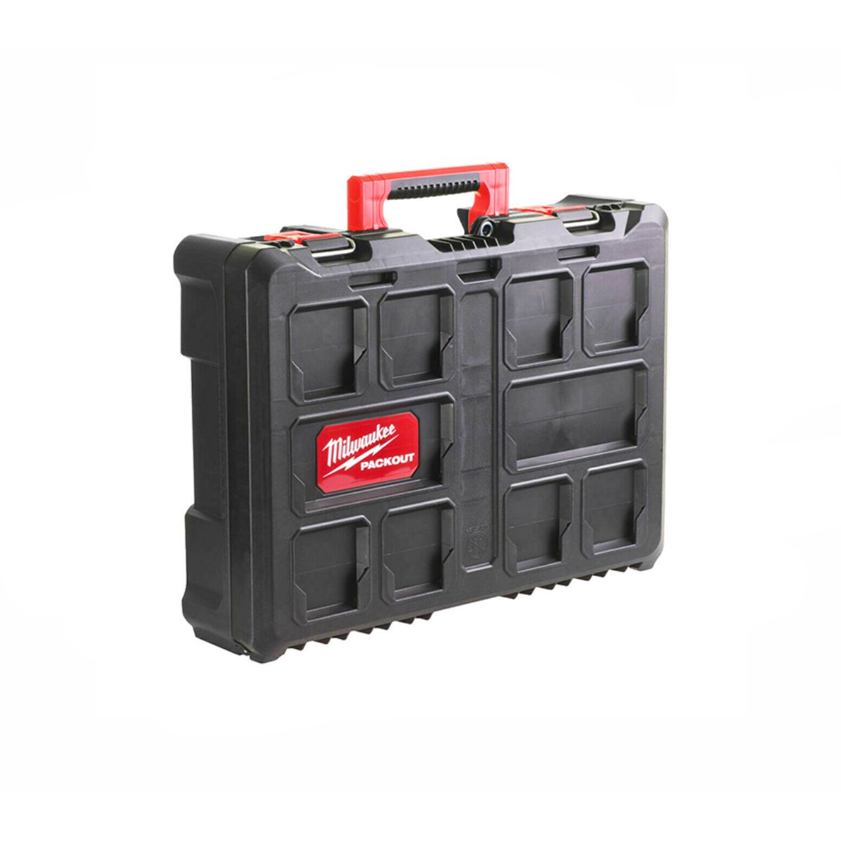 Куфар Milwaukee PACKOUT 1 е висококачествен професионален куфар, изработен от удароустойчива пластмаса. Разполага с подсилена дръжка за по-голям комфорт при по-тежък товар. Модулната система за съхранение на Milwaukee PACKOUT революционизира транспортирането, организацията и съхранението на инструменти. Разполага и с място за зарядно устройство и батерии. IP65 запечатана метеорологична пломба за предпазване от дъжд и отломки на площадката. Метални подсилени ъгли. Метална подсилена заключваща точка. Оборудван е с мека подложка.