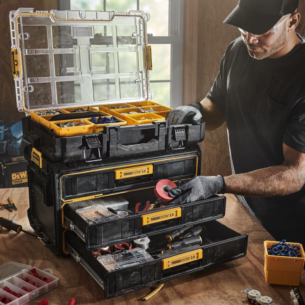 Куфар с чекмеджета Dewalt DWST08330 с размери 554х313х320 мм разполага с три издръжливи чекмеджета от ABS пластмаса, оборудвани с метални плъзгачи със сачмени лагери за плавно движение. Патентованите странични закопчалки позволяват лесно свързване с други куфари и органайзери от серията Toughsystem, създавайки удобна модулна система. Кутията осигурява капацитет от 25 л и товароносимост до 19.8 кг на всяко чекмедже, което я прави подходящ избор за професионална употреба.