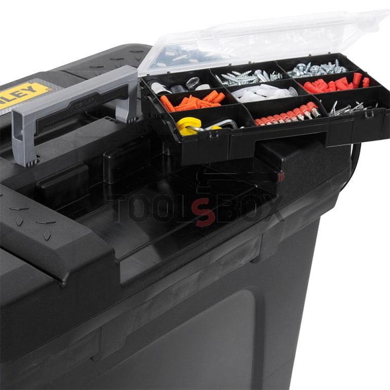 Подвижен органайзер: Лесно се изважда, предназначен за дребни аксесоари. Специална табла на дъното за електрични инструменти. V образен жлеб за рязане с трион на обекта. Полезен обем: 53 Литра/12 Галона.