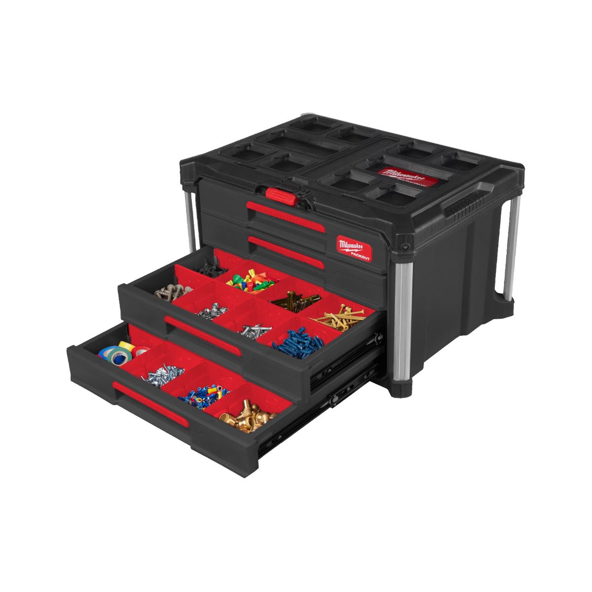 Куфар за инструменти с чекмеджета Milwaukee 4932493189 е част от модулната система за съхранение PACKOUT™ и предлага лесен достъп до съхраняваните артикули, дори когато други кутии от системата са подредени отгоре. Плъзгачите със стоманени сачмени лагери на чекмеджетата издържат до 11 кг тегло, осигурявайки надеждност и издръжливост. Всяко чекмедже разполага с бързо регулиращи се разделители, което позволява персонализиране на оформлението за по-добра организация на инструментите и аксесоарите. Заключващата защитна лента предотвратява нежеланото отваряне на чекмеджетата по време на транспортиране, а възможността за заключване с катинар осигурява защита от кражба. Куфарът е изработен от удароустойчиви полимери и подсилени с метал ъгли, което гарантира издръжливост на тежки условия на работното място. Идеален е за професионалисти, които търсят надеждно и организирано решение за съхранение на своите инструменти и аксесоари.