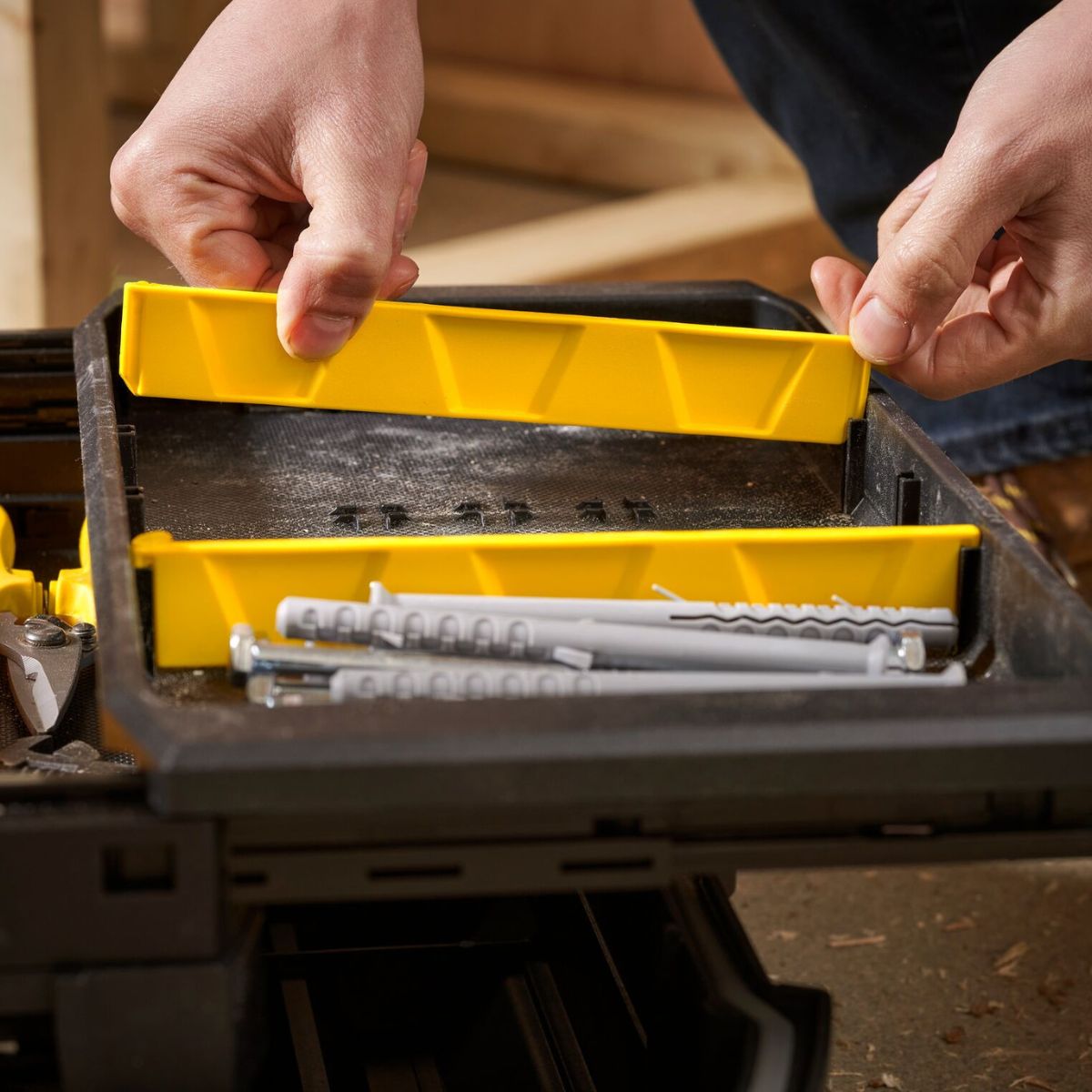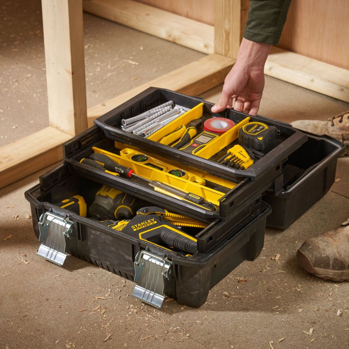 Куфар за инструменти STANLEY FMST1-71219 е изработен от висококачествена и издръжлива пластмаса. Той предлага вътрешни подвижни тавички, което го прави удобен органайзер на няколко нива, побирайки повече инструменти. Оборудван с няколко разделители, които помагат за персонализирането на пространството и инструментите. Металните закопчалки на куфара гарантират сигурно затваряне без проникването на вода или прах. Допълнително, капакът на куфара е твърд и служи за подложка за рязане на тръби и други материали, осигурявайки максимално удобство.