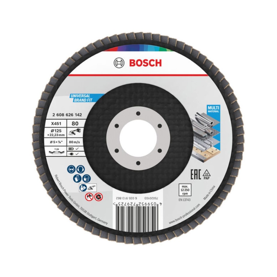Ламелен диск Bosch 2608626142 е предназначен за ефективно шлайфане и премахване на ръжда от метал и почистване на дърво. Изработен е със зърна от здрав алуминиев оксид за дълготрайна работа и е подсилен със здрава подложка от фибростъкло за по-висока устойчивост. Подходящ е за използване с малки ъглошлайфи, като осигурява надеждно шлайфане и заглаждане на ръбове.