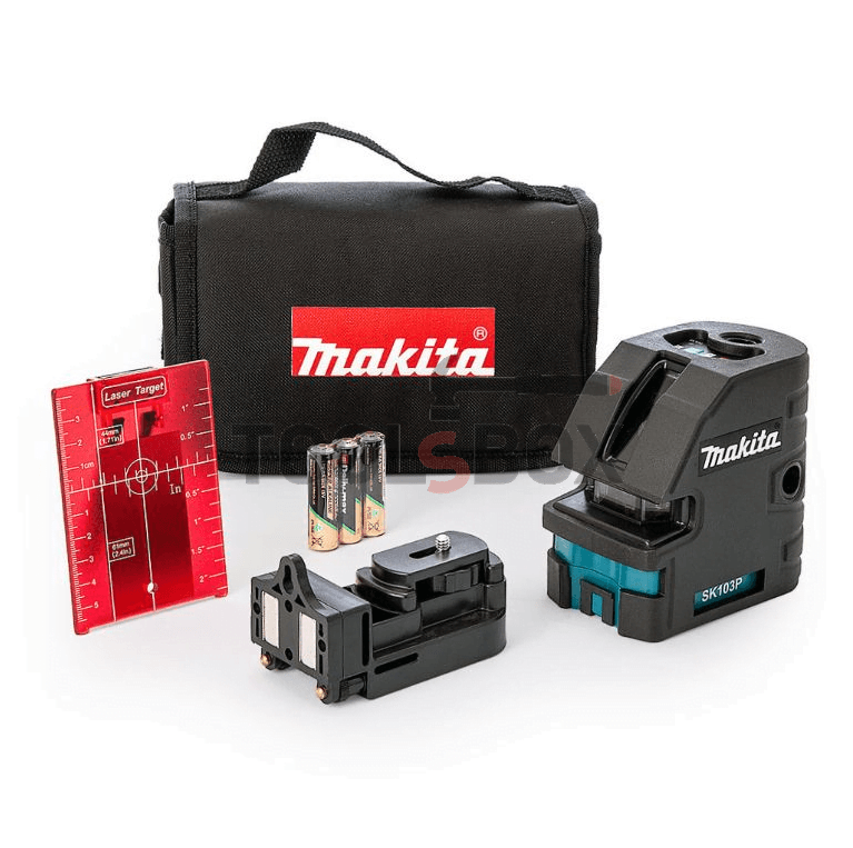 Лазерен линеен нивелир Makita SK103PZ. Вертикален, хоризонтален и 4-точков лазер (горе/долу, ляво/дясно). Самонивелираща се оптика позволява работа на яркоосветени места. Защита от прах и пръски вода – IP54. Измервателен обхват 15 м. Възможно разширяване до 60 м с допълнителен приемник. Диапазон на измерване – 15 м. Клас на лазера II. Клас на защита – IP54. Захранване с батерии AA 1,5V (3x). Точност± 3 мм. Обхват на самонивелиране 4° ±1°. Точност по вертикала± 0,75 мм / 3 м. Доставя се с магнитна стойка, лазерна мишена, 3 батерии АА и текстилнен калъф.