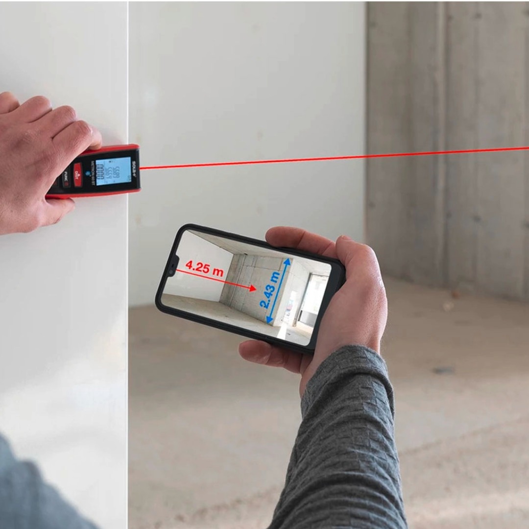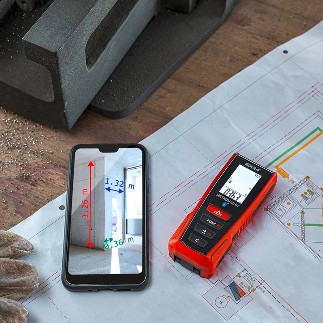 Лазерна ролетка Sola Metron 60 BT е надежден и прецизен инструмент за професионални измервания, предлагащ работен обхват от 0.05 до 60 метра и точност ±1.5 мм. Тя разполага с девет функции, които позволяват измерване на дължина, площ, обем, минимални и максимални стойности, както и извършване на непреки измервания по методи с две или три точки и различни аритметични операции. Благодарение на Bluetooth връзката уредът може да се свърже със смартфон чрез приложението SOLA Measures app, като дава възможност за запаметяване на до 30 резултата и лесно споделяне на измерванията. Освен това LCD дисплеят с подсветка осигурява ясно разчитане на данните при всякакви светлинни условия. Лазерната ролетка е защитена от прах и влага, което я прави подходяща за работа на открито. Захранва се с литиево-йонна батерия и предлага удобни функции за бързо и ефективно документиране на измерванията.