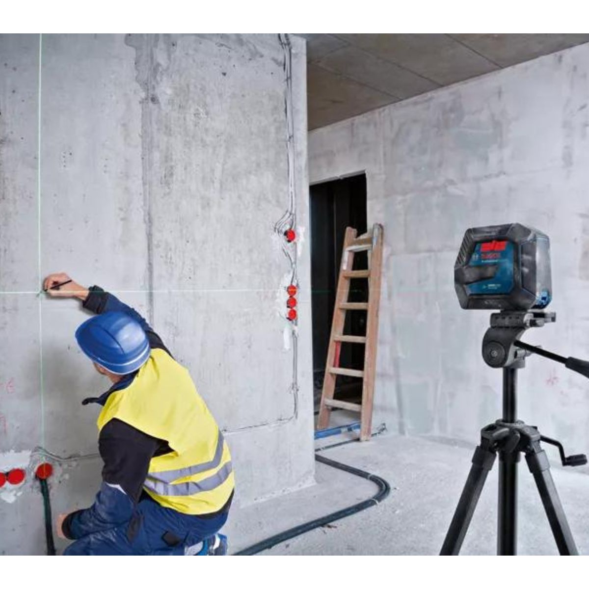 Линеен лазерен нивелир BOSCH GLL 2-15 G е проектиран с издръжлива конструкция, която се отличава с гумиран корпус и вдлъбнати лещи, осигуряващи защита срещу прах и водни пръски съгласно стандарта IP 64. Тази защита прави уреда подходящ за използване в тежки условия на обкръжаващата среда. Нивелирът разполага с превключвател за ВКЛ./ИЗКЛ. и клавиатура с един бутон, което го прави изключително лесен за използване. Зелените лазерни линии на устройството осигуряват повишена видимост на хоризонталната и вертикалната линия, което улеснява работата дори в по-слабо осветени условия. GLL 2-15 G Professional осигурява работен обхват до 15 m и обхват на самонивелиране до +/- 4° за по-малко от 4 s. Мишената осигурява голяма прецизност при работа.