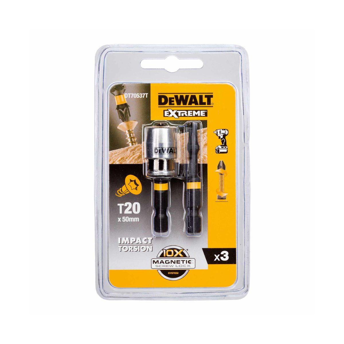 Магнитен адаптoр с 2 бита T20 DeWALT DT70537 е висококачествен инструмент, който се доставя с 2 бр. T20 бита. С дължина от 50 мм, той разполага със силен магнит, осигуряващ удобен и сигурен захват. Изработен от висок клас неръждаема стомана, той гарантира висока издръжливост и дълъг живот. Предпазва бита при пиков въртящ момент и има движение по-малко от 4°.