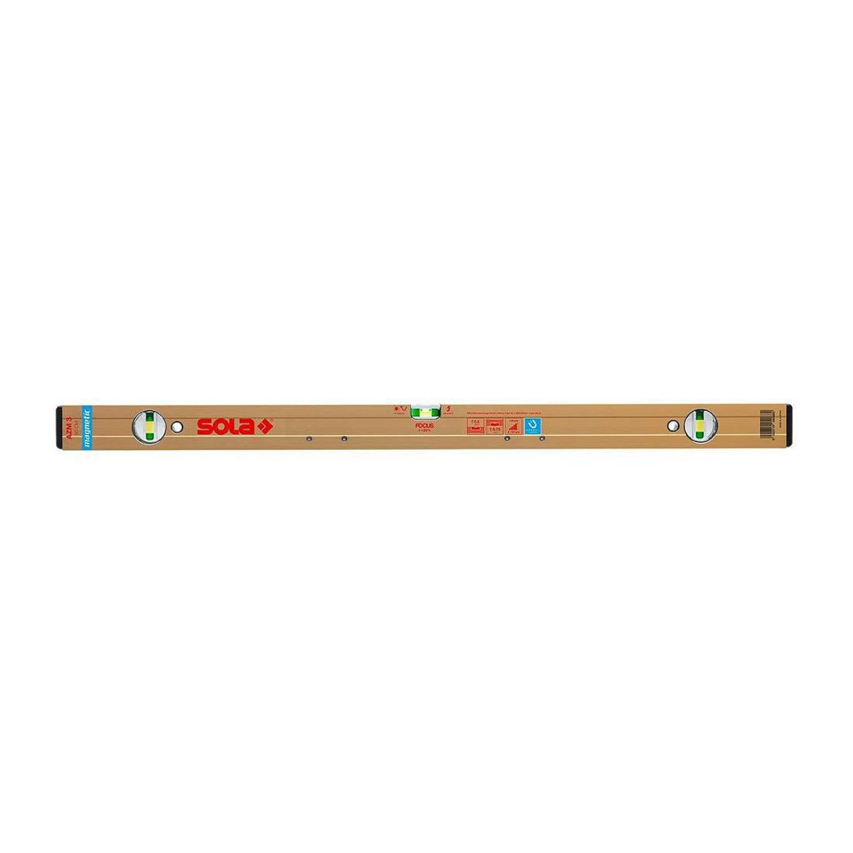 Магнитен алуминиев нивелир Sola AZM 120 е с дължина 120 см и точност на измерване от 0.5 мм/м. Той разполага с 1 вертикални и 1 хоризонтална нечуплива либела Focus с лупа, увеличаваща изображението до 60%. Нивелирът е с епоксидно покритие и е оборудван с ударопоглъщащи пластмасови накрайници, които осигуряват оптимална защита срещу повреди. Специалната подложка в либелите гарантира по-добра видимост при слаба светлина. Нивелира разполага със силни магнити, гарантиращи дълъг експлоатационен живот. Предлага по-добро отчитане при здрачаване чрез оптимизираното светещо покритие на SOLA.