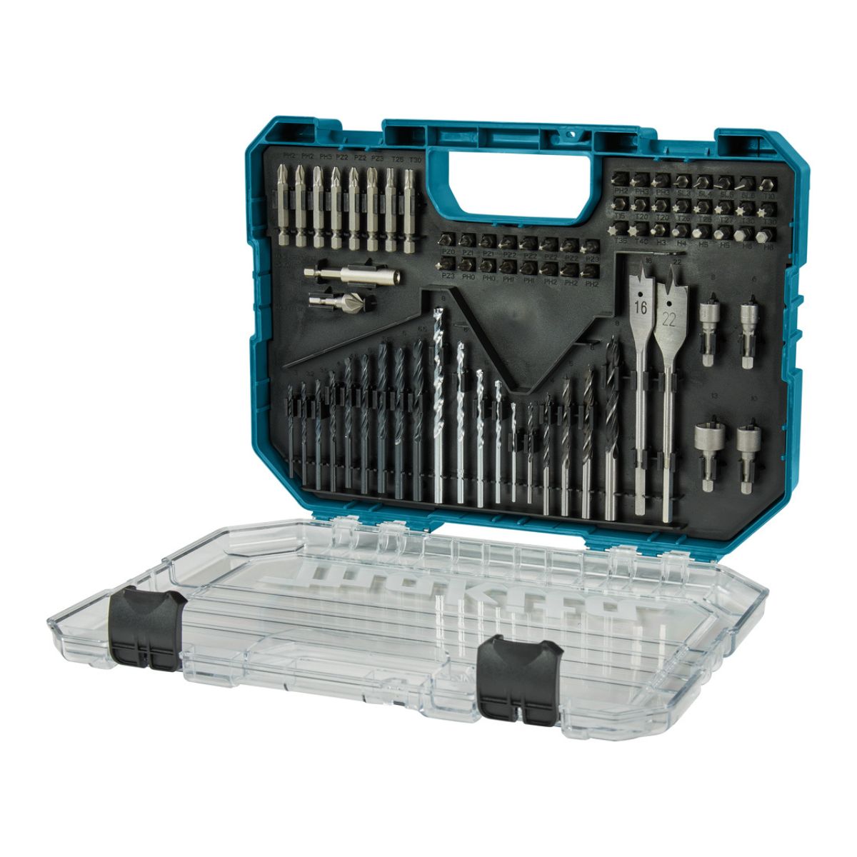 Makita E-15126 Комплект битове и свредла включва всички необходими инструменти на един майстор за една добре свършена работа. Включва селекция от свредла за дърво и метал, накрайници за винтоверт във всички най-популярни размери, бит за зенкер, 1/4″ шестоъгълен магнитен държач за бит и много повече. 75 броя свредла и битове се съхраняват в удобен пластмасов куфар за лсно съхранение и транспортиране до работното място.