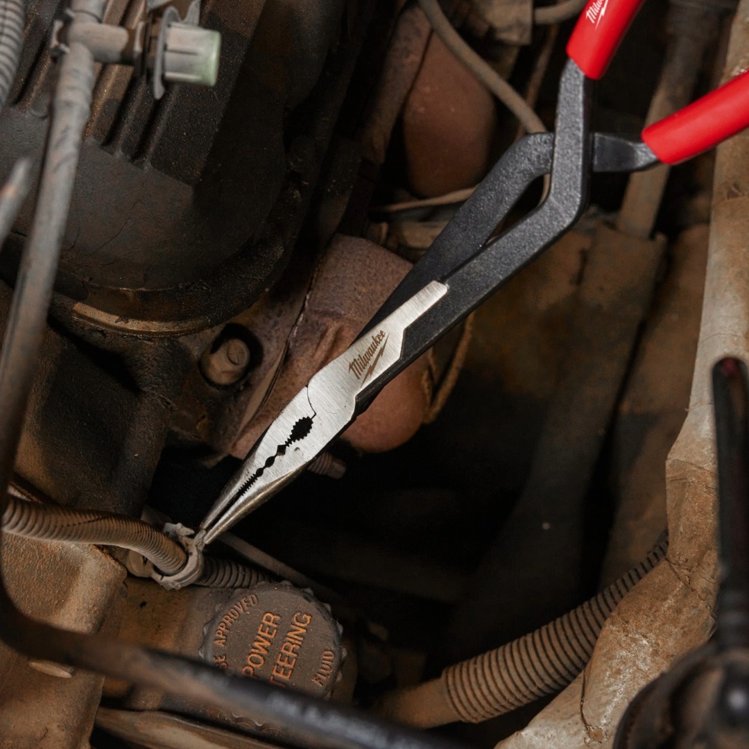 Монтажни клещи Milwaukee 4932492499 са проектирани за прецизна работа в тесни и труднодостъпни пространства, като осигуряват отличен контрол и сигурен захват. Благодарение на удължената конструкция с дълбок достъп и вариант с прави челюсти и 45° ъгъл, те позволяват лесно достигане до зони, които са трудни за обработка със стандартни клещи. Многофункционалните зони за захващане дават възможност за работа с различни материали като винтове, кабели и кръгли детайли, което ги прави универсален инструмент за монтажни и сервизни дейности. Конструкцията с единичен шарнир осигурява по-добър контрол и по-силен захват в сравнение с двойните шарнири, а назъбеният и текстуриран връх поддържа стабилност при захващане, завъртане и манипулиране на детайли. Клещите са подходящи за професионална употреба, където се изискват надеждност, прецизност и удобство при работа.