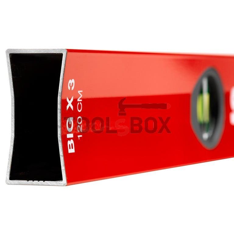Алуминиев нивелир модел SOLA BIG X 3. Алуминиев тръбен с червено покритие, тегло на профила около 630 гр./ лин.метър, размер около 50 x 25 мм, 1 хоризонтална либела, 2 вертикални либели. Мax. отклонение в стандартна позиция: 0,5 мм/м (0,029°), в обърнато положение: 0.75 мм/м (0,043°). Предимства: електронно контролирана либела, нечуплива либела от акрилно стъкло. Хоризонтална либела с увеличителна леща и светещо покритие, омекотяващи удара капачки. Приложение: при строителни и зидарски работи, при полагане на подови покрития, изграждане на инсталации.