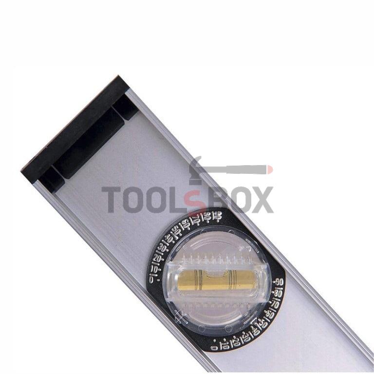 Алуминиев корпус за по-голяма здравина • 1 хоризонтална, 1 вертикална и 1 въртяща се либела с градусомер до 180 °. Горната оснава е с оразмерена линийка. • Удароотпорни накраиници • Прецизност 1.5 мм/м