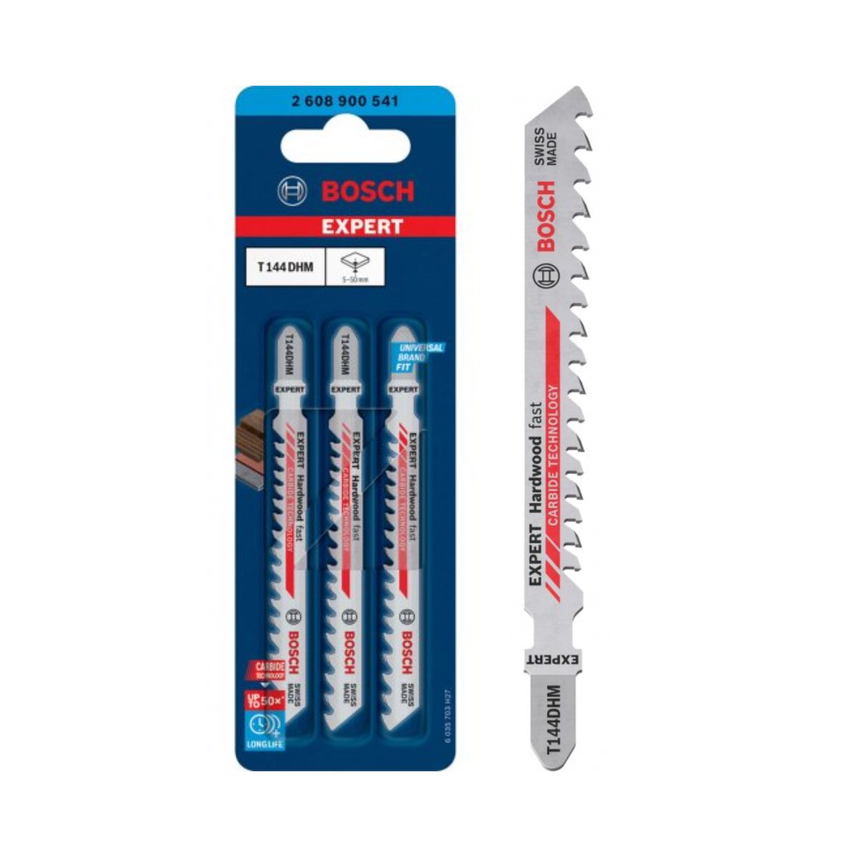 Нож за прободен трион Bosch EXPERT Hardwood Fast T144DHM 2608900541 е иновативно решение за рязане на твърда дървесина и дървесно-композитен материал WPC. Изработен чрез специално шлифоване на зъбите от карбид, който материал позволява бързо и ефективно рязане. Освен това благодарение на висококачствения материал ножовете издържат много по-дълго от стандартните ножчета. Препоръчва се рязане на материал с минимална дебелина от 5 мм и максималана дебелина 50 мм, за по-добри и прецизни резултати. Те са с дължина от 100 мм и са с T-образен захват, като се доставят в комплект от 3 бр.