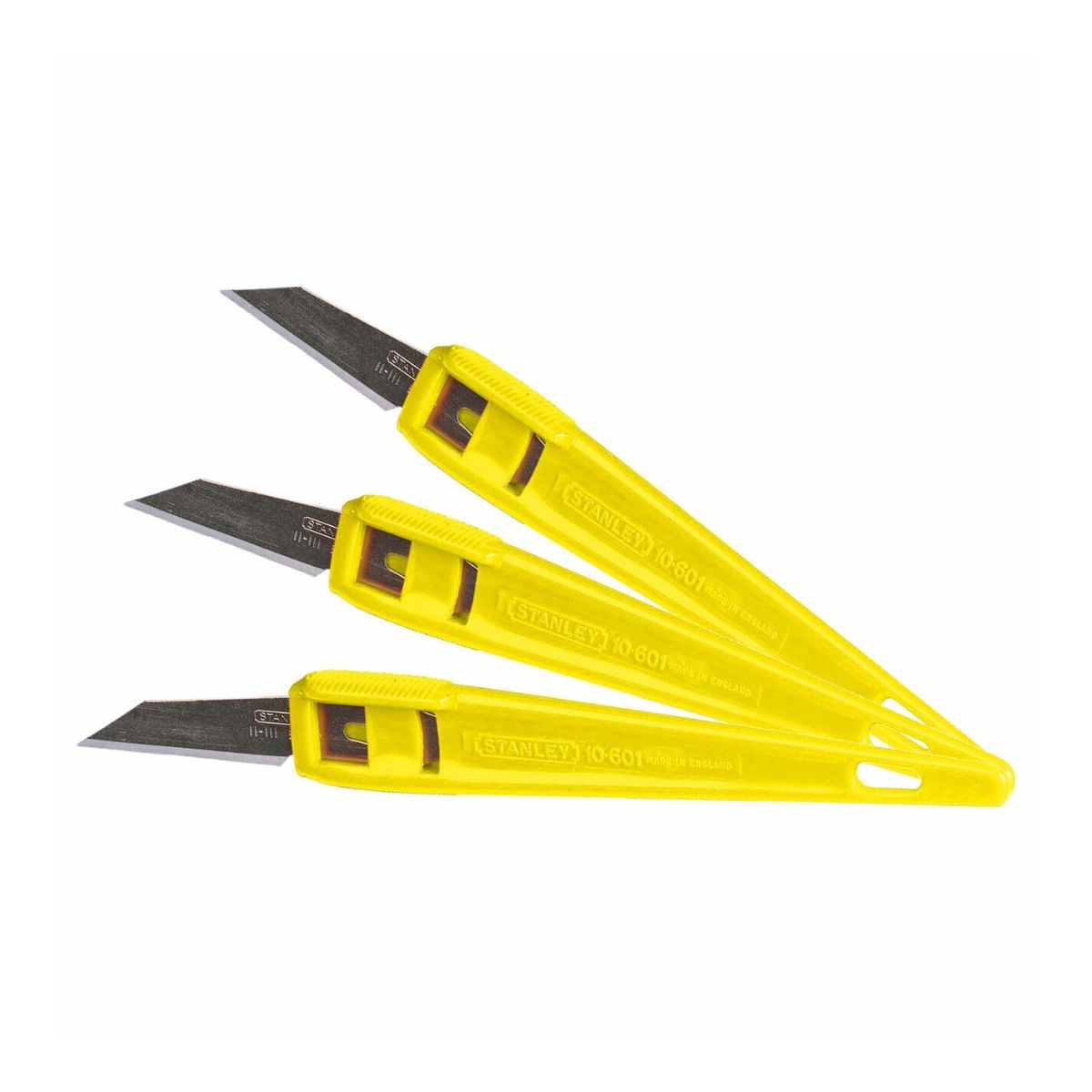 Ножчета за еднократна употреба STANLEY 0-10-601 са предназначени за множество разнообразни материали като хартия, картон, пластмаса и др. Пластмасовата дръжка осигурява сигурен и удобен захват, а заостреното острие гарантира прецизност по време на работа. Предназначени са за еднократна употреба и след захабяване на острието, то не се заменя. Предлагат се в опаковка от 3 бр.