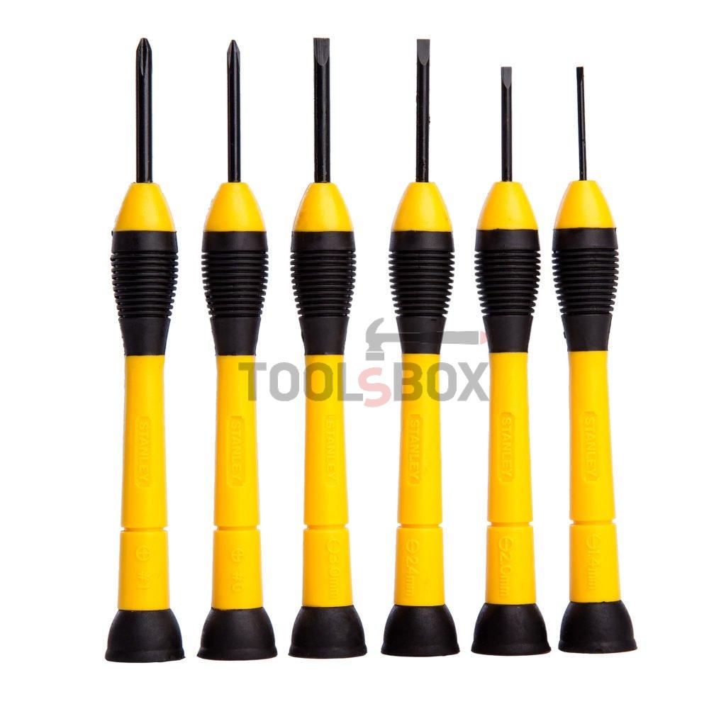 Дръжки с въртяща се глава осигуряват прецизност и достъп. Стволове с галванично покритие, набраздени за стабилен и здрав захват. Закалени стоманени накрайници с оксидирано покритие за устойчивост при корозия. Пластмасова кутия за съхранение.