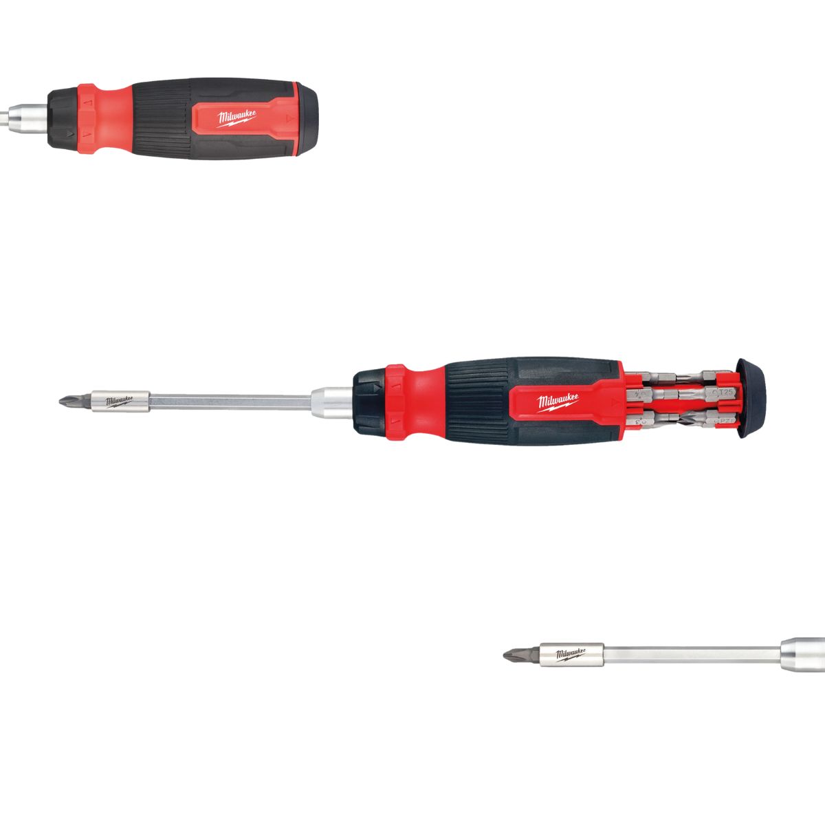 Отвертка с тресчотка 14 в 1 Milwaukee 4932480582 е с изцяло метална тресчотка с висок въртящ момент за двойна скорост и контрол. Прецизно закалени накрайници за битове за безопасен монтаж и дълъг живот. Съхранение на битове в дръжката. Хромирани накрайници, защитени от корозия. Ергономичната отвертка е с 1/4″ захват и с лазерно гравирани размери за лесно разпознаване. Отвертката предлага 13 бр универсални бита за максимална удовлетвореност.