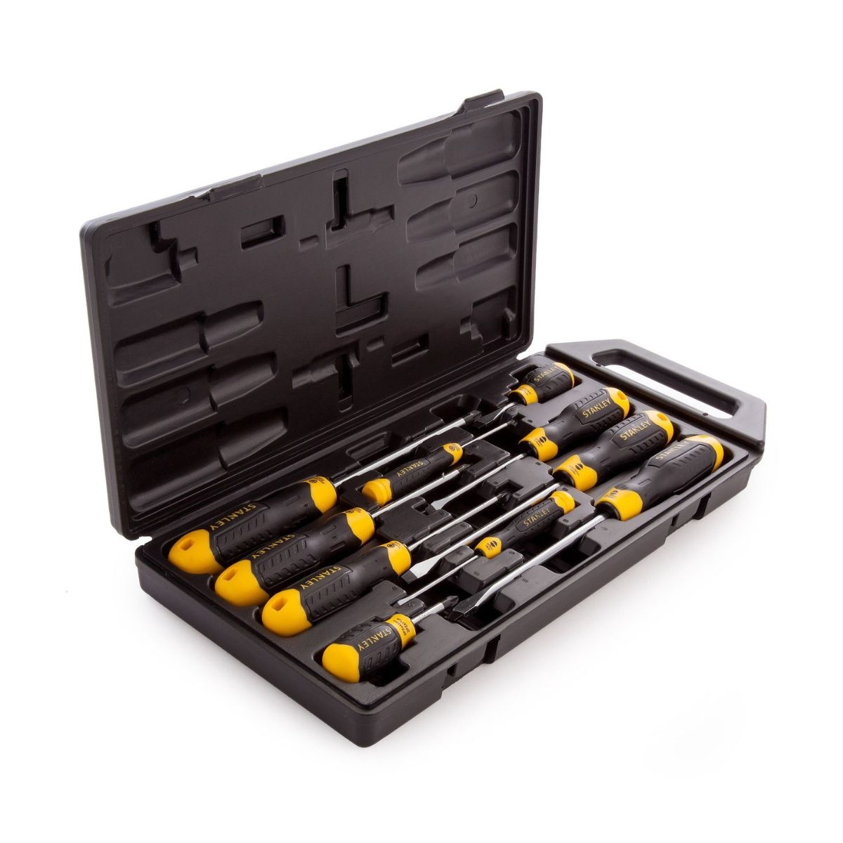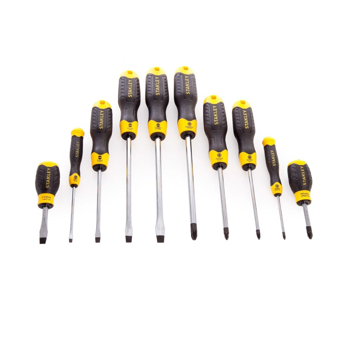 Отвертки комплект STANLEY 2-65-014 представлява надежден инструмент, който ще ви помогне да изпълните различни видове завинтвания и монтажни задачи с лекота и професионализъм. Включва 10 отвертки с разнообразни размери и видове стандартни (SB) и кръстати (PZ) върхове. Основата на отвертките са изработени от висококачествена стомана, което гарантира издръжливост и дълготрайност. Връховете на отвертките са магнетизирани, което улеснява захващането и работата с винтове, особено в трудно достъпни места. Дръжката на всяка отвертка е дебела, еластична и с двукомпонентно покритие, което предоставя по-добър контрол по време на работа, по-голяма сила на въртене и по-голям комфорт.