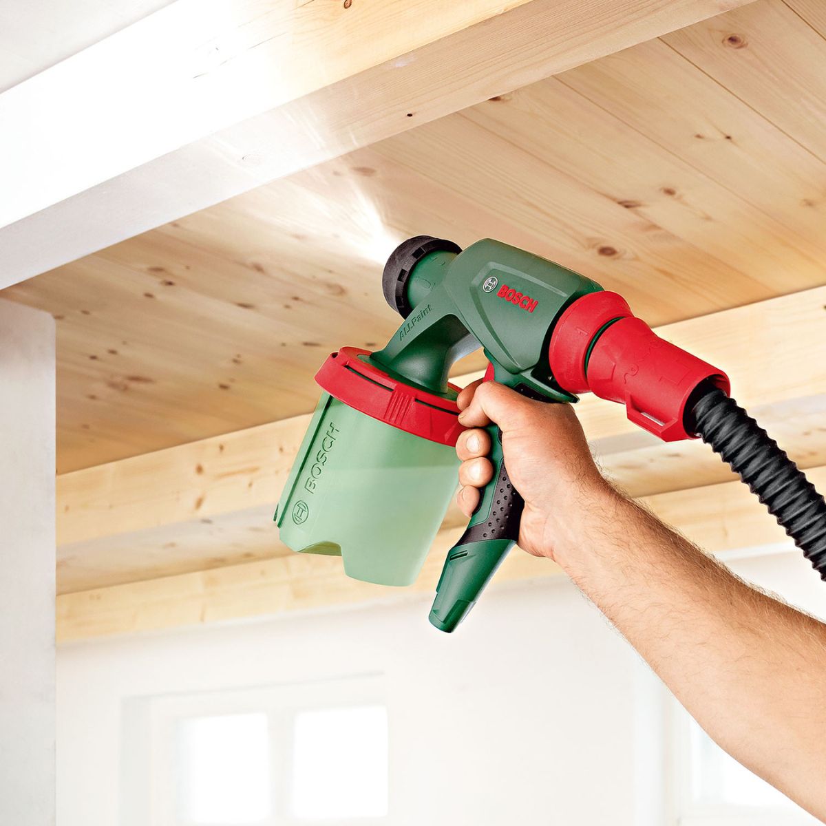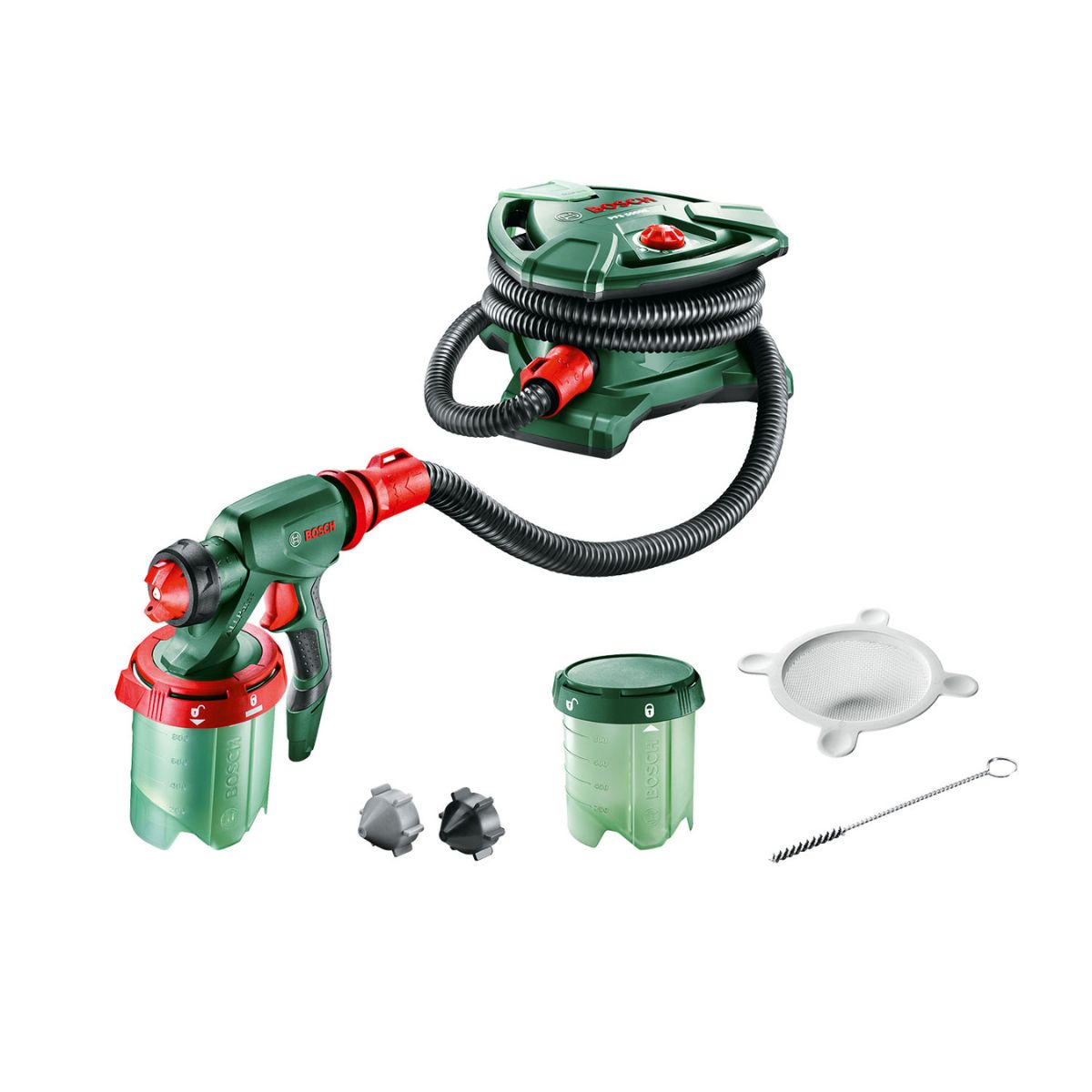 Пистолет за боядисване BOSCH PFS 5000 E осигурява лесно и равномерно пулверизиране на всички видове бои без необходимост от разреждане, благодарение на технологията ALLPaint. Практичната SDS система позволява бързо допълване и лесно почистване, а ConstantFeed резервоарът гарантира равномерно подаване на боя дори при работа над глава или близо до пода. С въздушен маркуч с дължина 4 м и вградени ролки, уредът осигурява максимална гъвкавост и удобство. Регулируемото количество въздух позволява прецизен контрол на нанасянето на боя, а крачният превключвател улеснява работата. Вградена функция за съхранение на маркуча и дюзите допълва практичността на този мощен инструмент.
