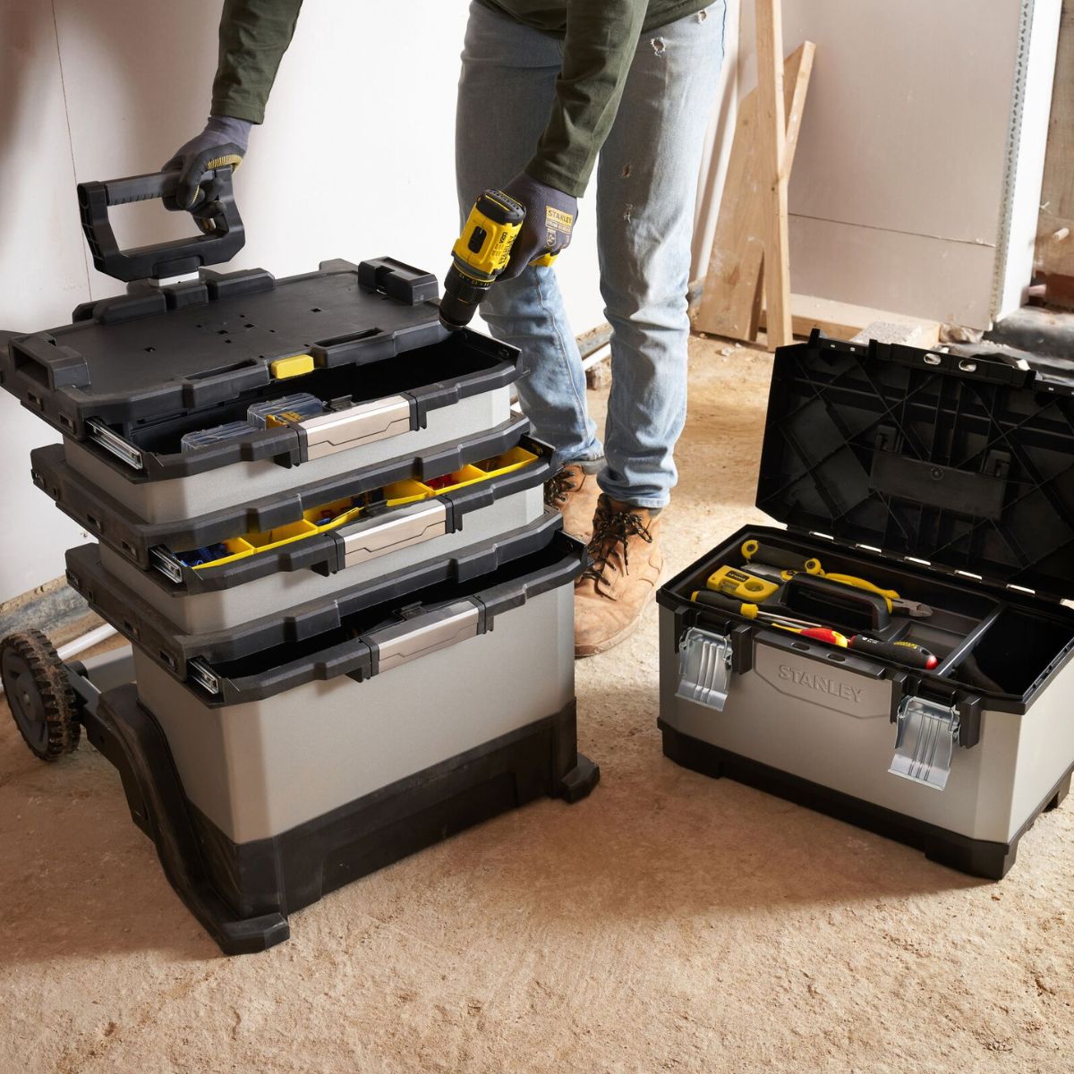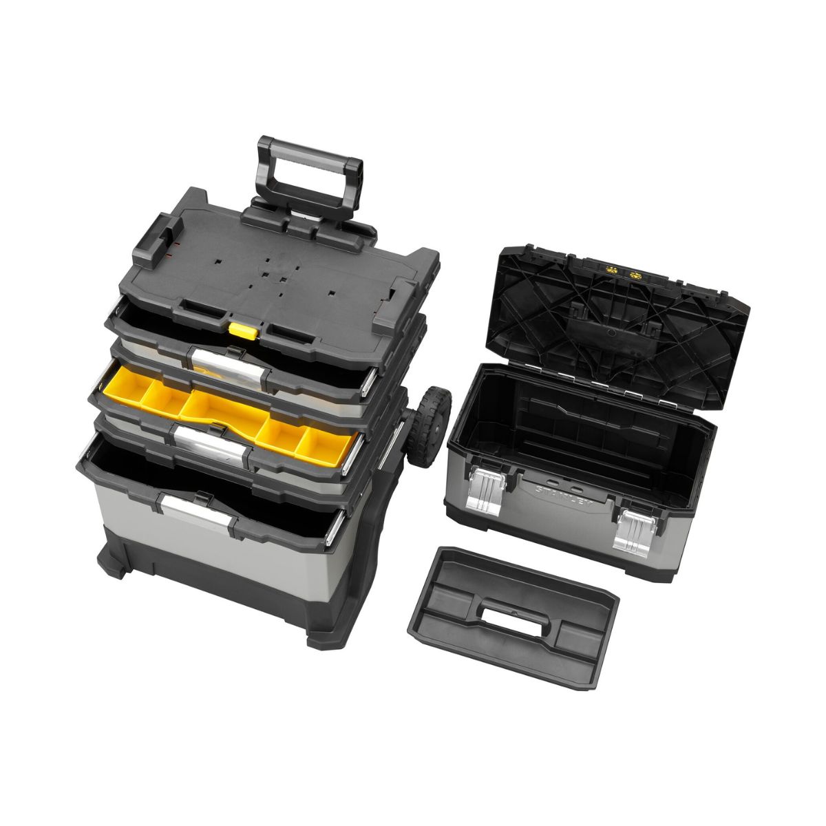 Пластмасов куфар за инструменти Stanley 1-95-622 е идеалното решение за организиране и транспортиране на вашите инструменти. С алуминиева телескопична дръжка, този куфар осигурява лесно и удобно пренасяне, дори когато е напълно натоварен. Здравите задни колела допълнително улесняват транспортирането върху различни повърхности, гарантирайки стабилност и издръжливост. Куфарът предлага четири нива на съхранение, които позволяват лесна организация на инструменти от различен размер – от най-малките крепежни елементи до големите инструменти. Подвижните органайзери предоставят гъвкавост при подредбата, като осигуряват бърз достъп до най-необходимите вещи. Със своята здрава и издръжлива конструкция, Stanley 1-95-622 е проектиран да издържа на тежки условия на работа, предоставяйки сигурност и защита за вашите инструменти.