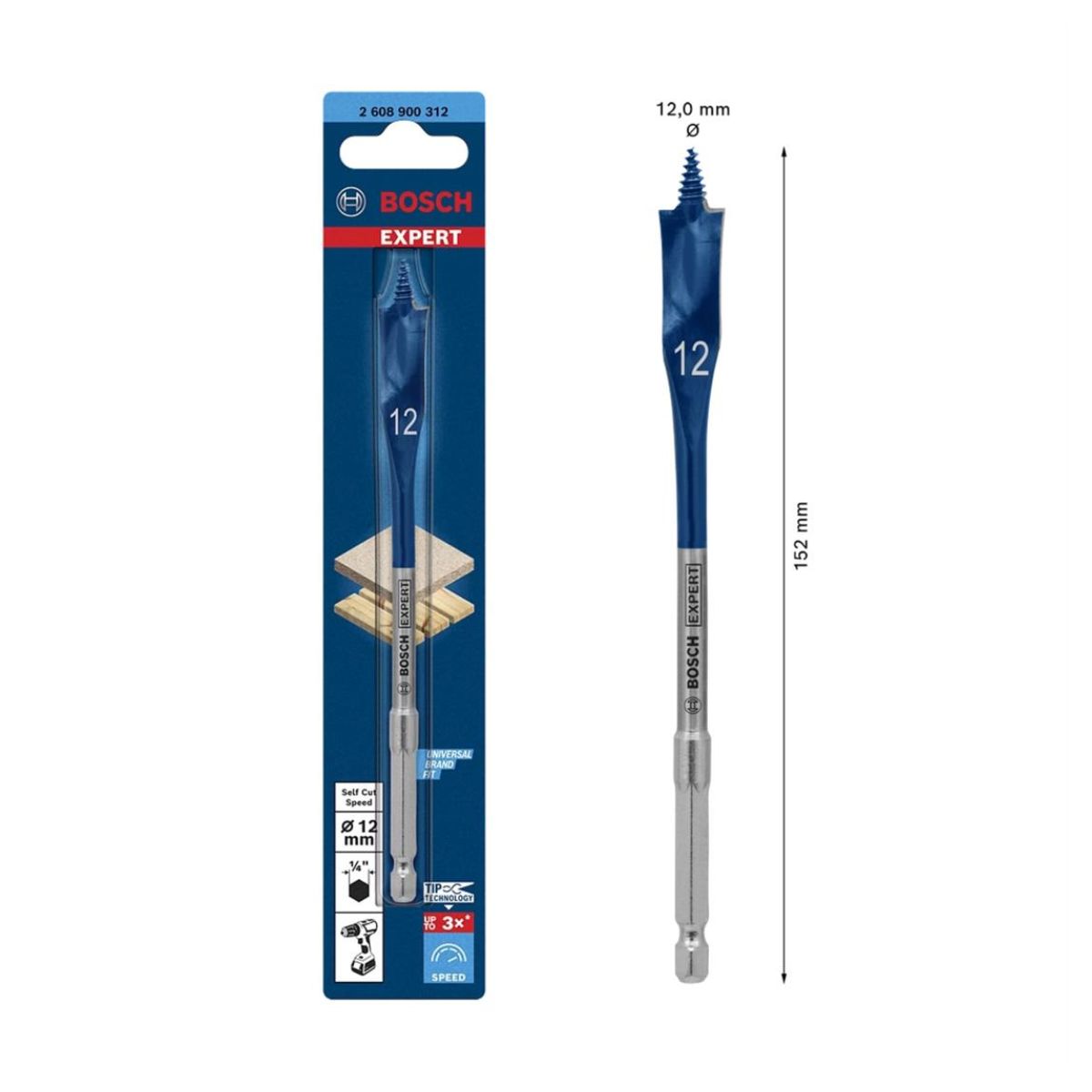 Плоско свредло Bosch 2608900312 извършва изключително бързо пробиване на отвори. Самозахранващ резбован връх осигурява високоскоростно пробиване с малко усилие. Бързо отстраняване на трески и бързи резултати са възможни чрез специално оформеното фрезово свредло. При тестване на продукти, това свредло създава отвори 10 пъти по-бързо от стандартното фрезово свредло. Подходящо е за използване върху мека и твърда дървесина, леки строителни материали и гипсокартон. 1/4-инчовата Hex дръжка се използва най-добре с преносими електрически пробивни машини.