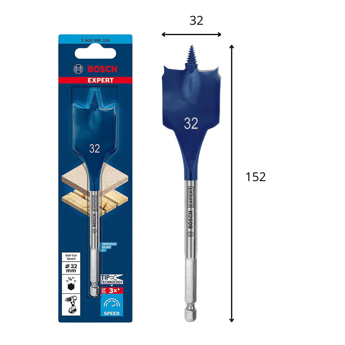 Плоско свредло Bosch 2608900326 извършва изключително бързо пробиване на отвори. Самозахранващ резбован връх осигурява високоскоростно пробиване с малко усилие. Бързо отстраняване на трески и бързи резултати са възможни чрез специално оформеното фрезово свредло. При тестване на продукти, това свредло създава отвори 10 пъти по-бързо от стандартното фрезово свредло. Подходящо е за използване върху мека и твърда дървесина, леки строителни материали и гипсокартон. 1/4-инчовата Hex дръжка се използва най-добре с преносими електрически пробивни машини.