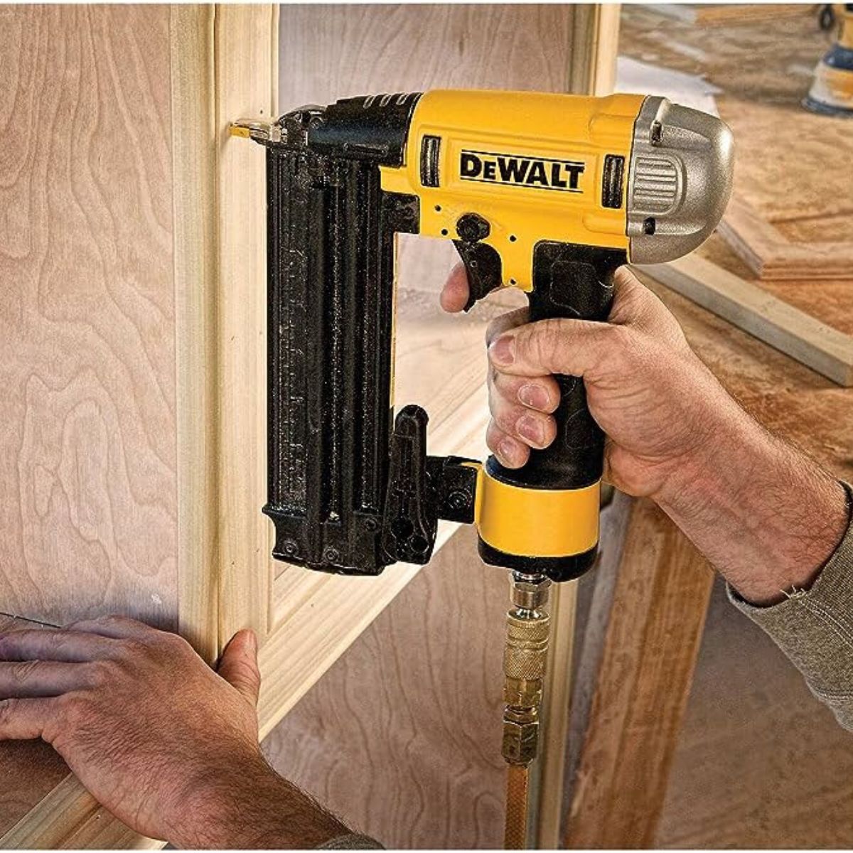 Пневматичен такер за пирони DeWaLT DPN1850PP е впечатляваща пневматична безмаслена машина за забиване на гвоздеи Brad, предназначена за разнообразни приложения с 18 габарита. Безмаслените такери предотвратяват оставянето на следи по материала. Този инструмент е особено внимателен към детайлите и се отличава с изключителна прецизност благодарение на своята носова част Precision Point. DEWALT DPN1850PP осигурява по-малко маркиране на работната повърхност, благодарение на иноватовният дизайн. Това подобрява видимостта и точността при работа. Машината е снабдена с удобна гумена ръкохватка, което прави работата комфортна и удобна дори при продължително използване. Задният изпускателен отвор предпазва от замърсяване и осигурява по-чиста работна среда. Такерът може да приема гвоздеи с дължина между 15 мм и 55 мм с 18 габарита. Инструментът предоставя избор между последователна и контактна работа и лесно регулируема дълбочина за прецизно забиване на гвоздеите. Оборудван с механизъм за освобождаване на задръстването без необходимост от специални инструменти за лесно отстраняване на блокиралите гвоздеи.