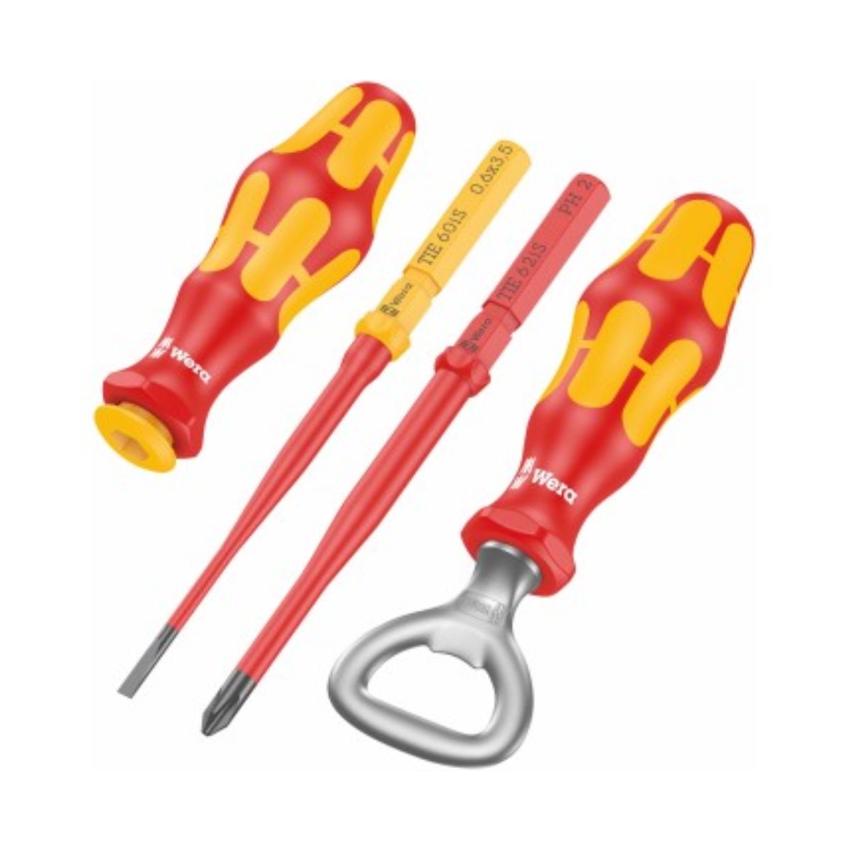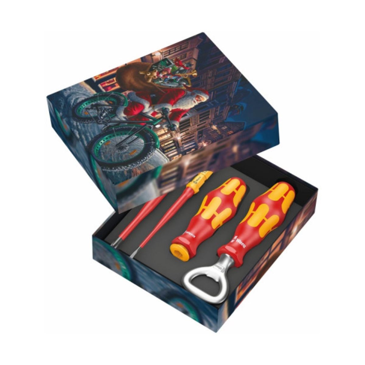 Подаръчен комплект Wera 05135816001 е перфектният начин да направите празниците още по-специални за професионални и хоби майстори. Включва функционални и висококачествени инструменти, които съчетават практичност и издръжливост. Комплектът включва 2K ръкохватка Kraftform 817 VDE, две сменяеми изолирани и изтънени отвертки, както и стилна отварачка за бутилки, вдъхновена от уникалния дизайн на WERA. Ръкохватката Kraftform осигурява комфорт и безопасност при работа, а шестостенната форма предотвратява нежелано търкаляне на инструмента. Изолираните дръжки и стебла са индивидуално тествани при напрежение до 1000 V, като отговарят на строгите стандарти на IEC 60900, гарантирайки максимална безопасност.