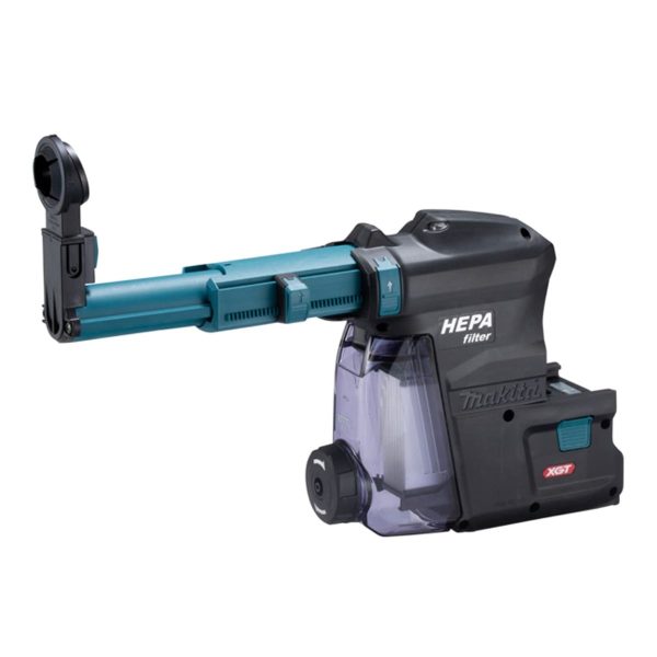 Прахоуловител с HEPA филтър за перфоратор Makita 191E54-9 е съвместимо с перфораторите HR001G и HR003G 40v Max XGT. То се свързва към корпуса на перфораторите и използва мощността на модула, за да работи автоматично, когато спусъкът е задействан. Устройството е проектирано да ефективно събира фин прах и частици. То е оборудвано с взаимозаменяем HEPA филтър, който улавя 99,97% от частиците с размери 0,3 микрона или по-големи. Филтърът разполага с почистващ механизъм, който осигурява поддръжка и запазва ефективността му. Контейнерът за прах е оборудван с прозрачен калъф, който осигурява лесна видимост и контрол върху нивото на събран прах. Има прост бутон за изпразване с едно натискане, което улеснява изпразването на праха. Двойните LED светлини осветяват работната зона, осигурявайки по-добра видимост при работа.